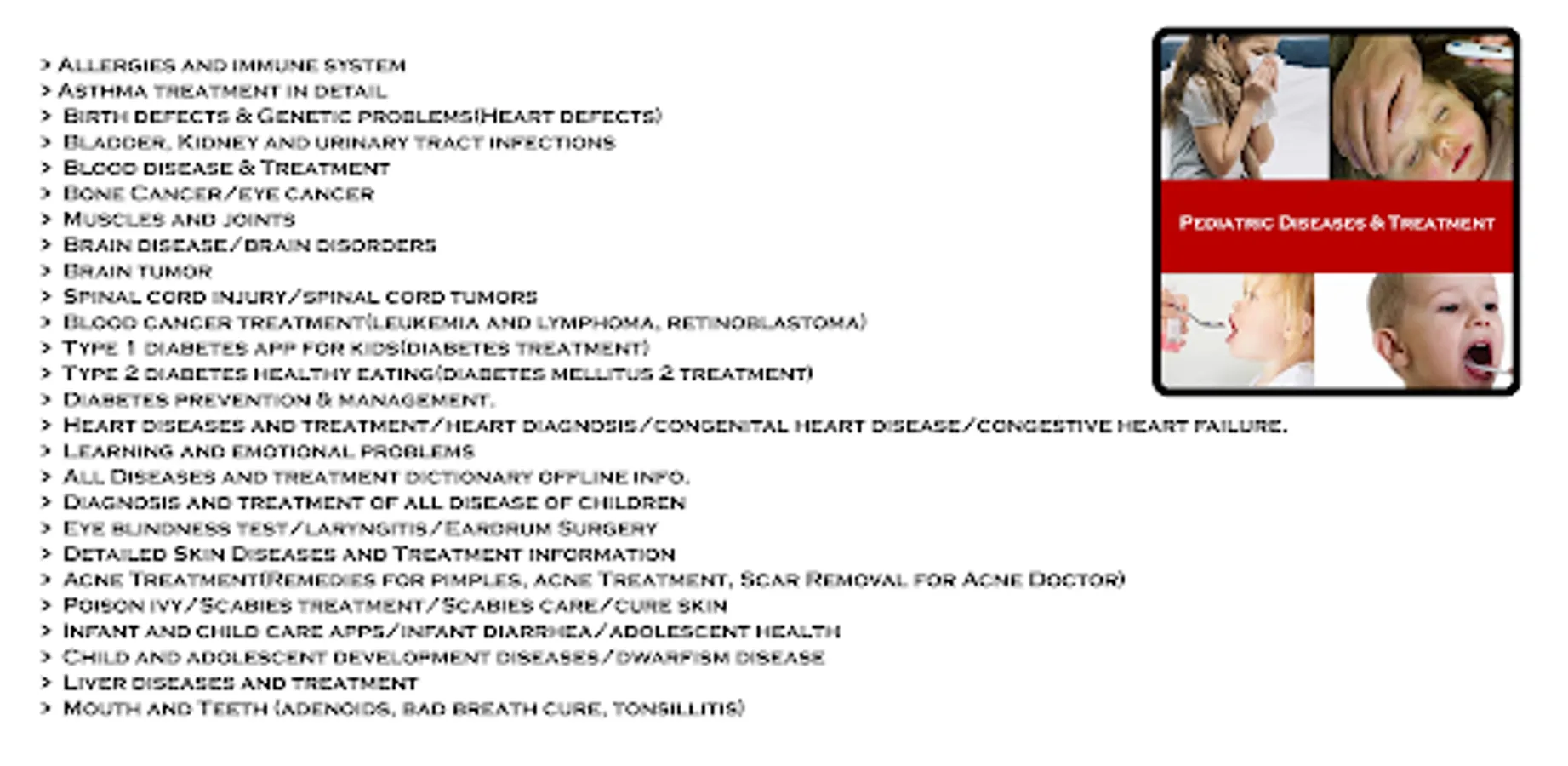 Pediatric diseases and treatment nursing app is free clinical medicine book for kids’ common diseases with all kids’ info, pediatric conditions, and disease symptoms and diseases treatment.