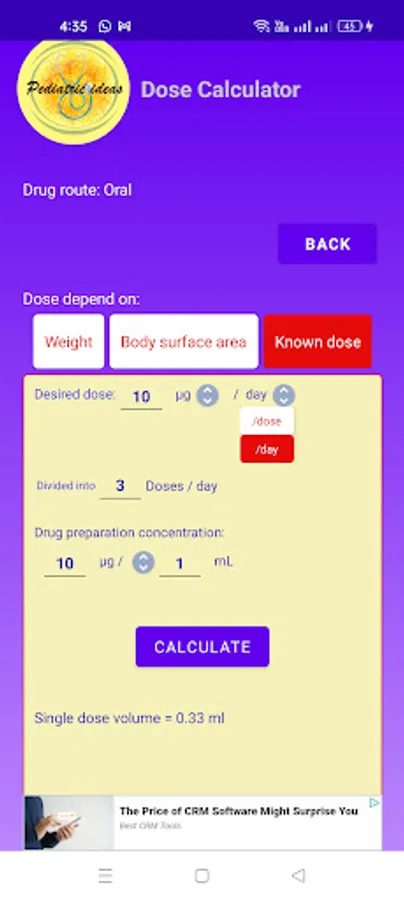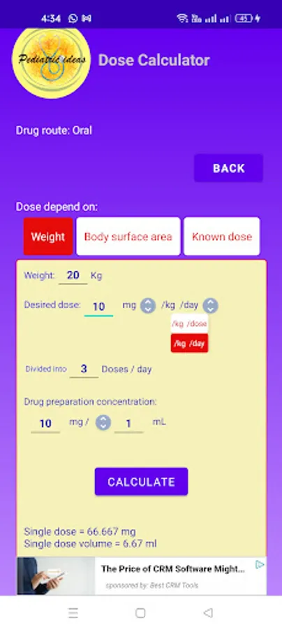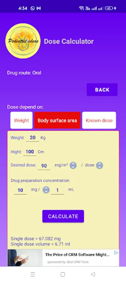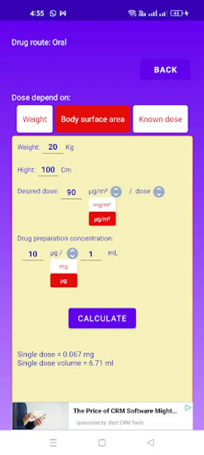 Calculator depending on Wt or BSA to calculate either oral or IV infusion drugs