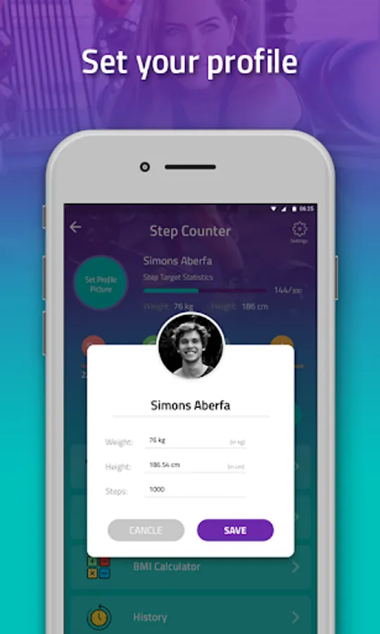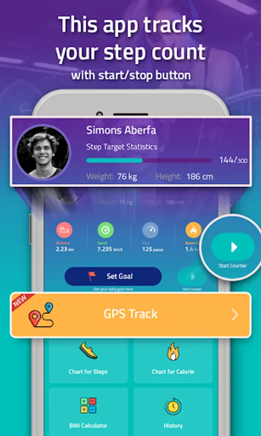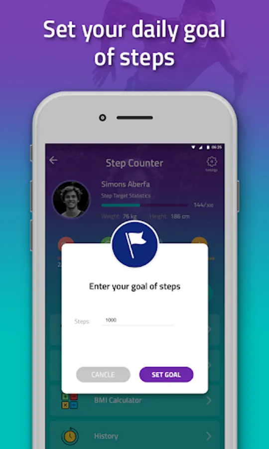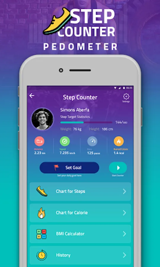 Download this Pedometer & Step Counter OR The Fitness App for free and set your profile to get started. Give your Height, Weight and set your daily goal to get started right away.