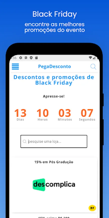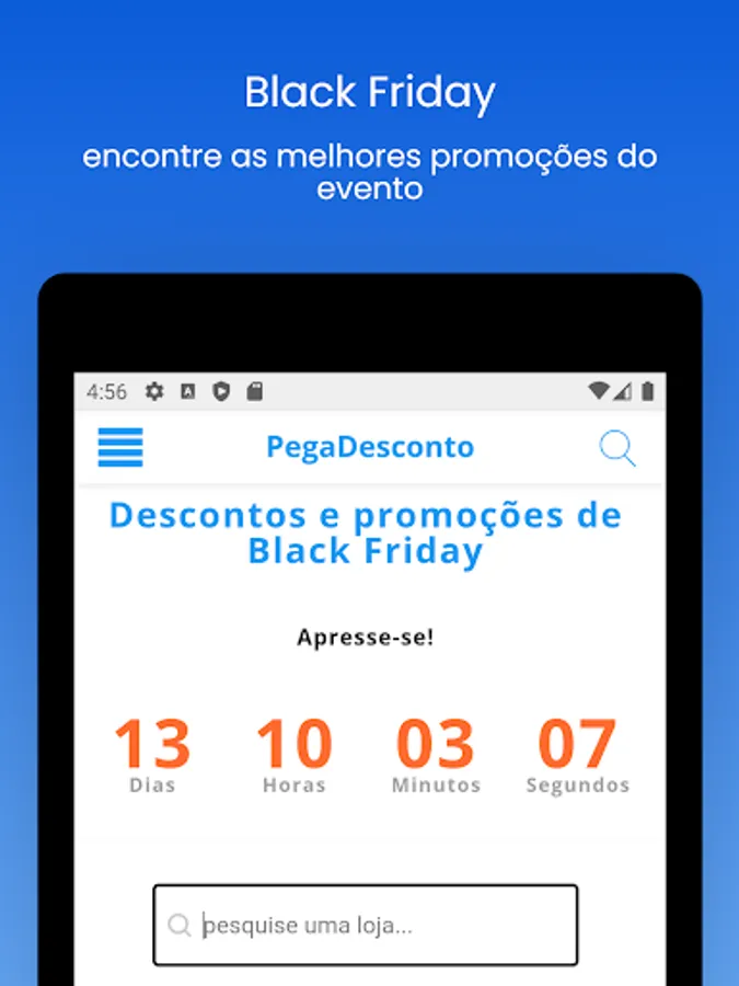 With the PegaDesconto app you get connected to the best promotions and settlement actions on the internet such as Black Friday, Consumer Day, Black Night and Christmas Greetings, plus free coupons to over 500 partner stores.