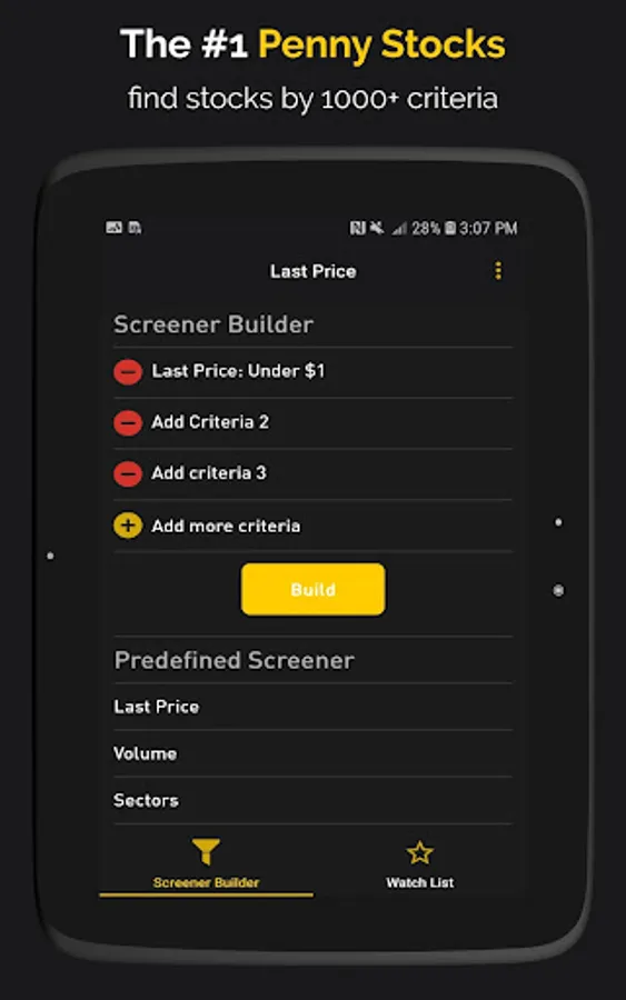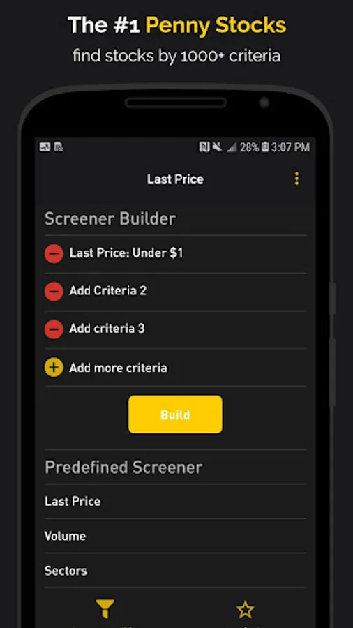 Penny Stocks Builder allows you to find potential penny stocks to invest by adding as many criteria as you want.