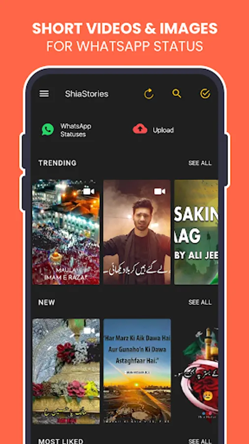 Shia Stories App provides you with short videos and images to end your daily search for status, with just one click you can put status on WhatsApp or on your favourite social media platform. Our App is packed with following features