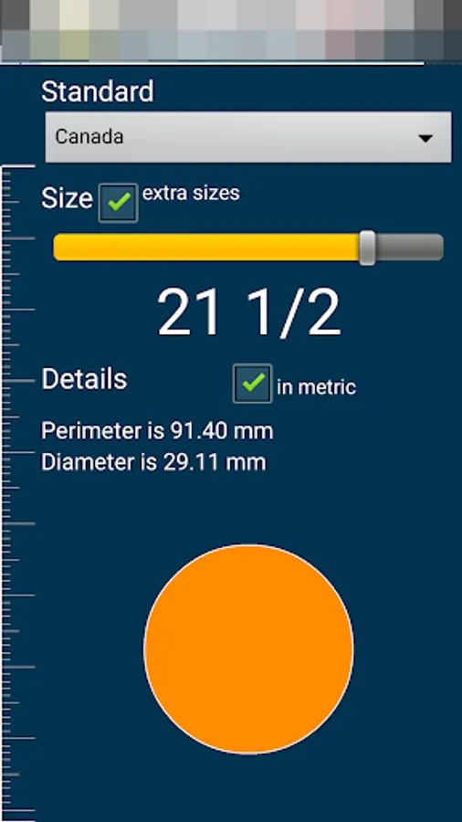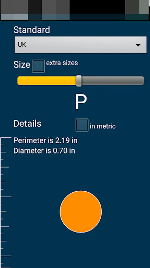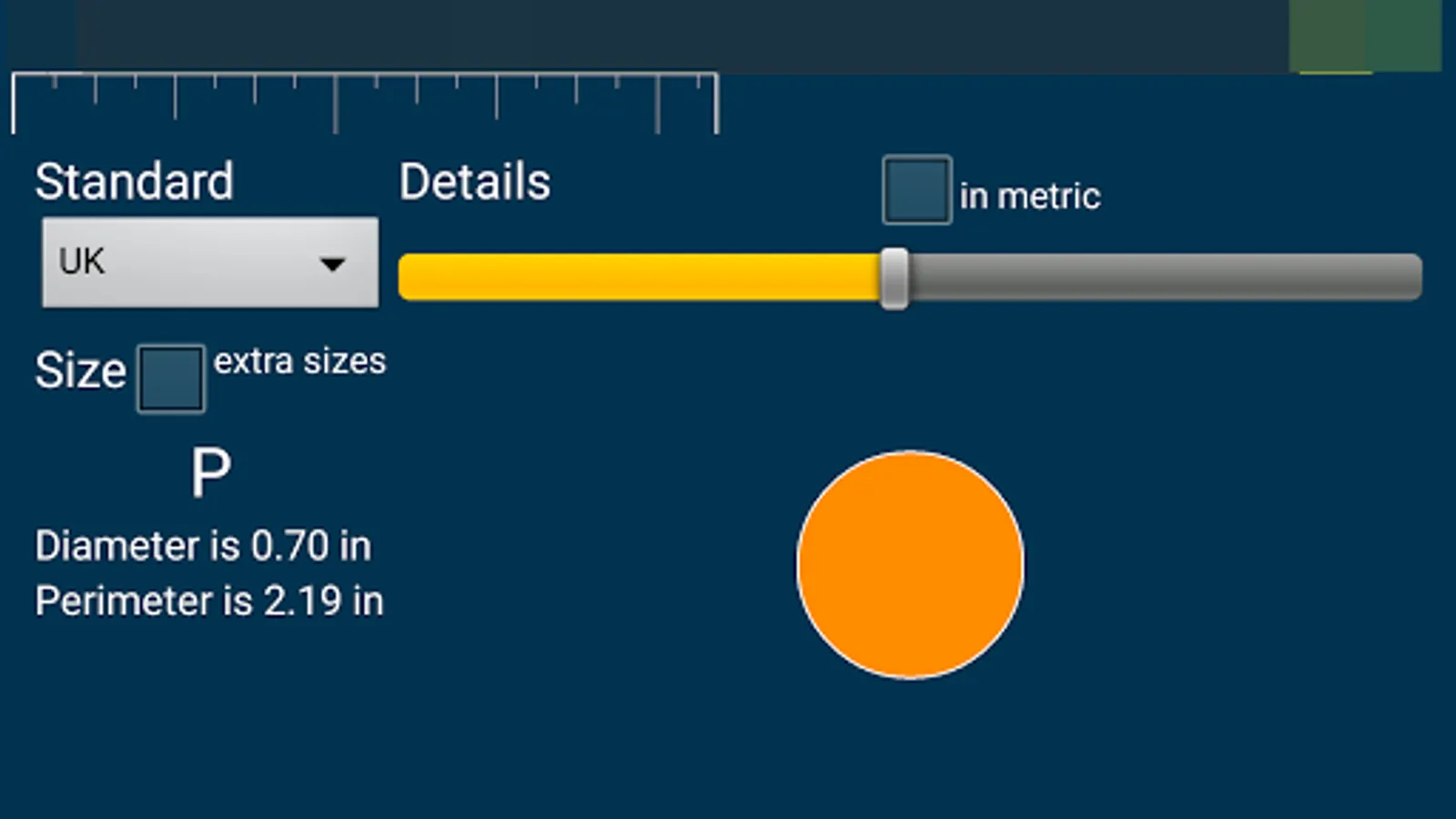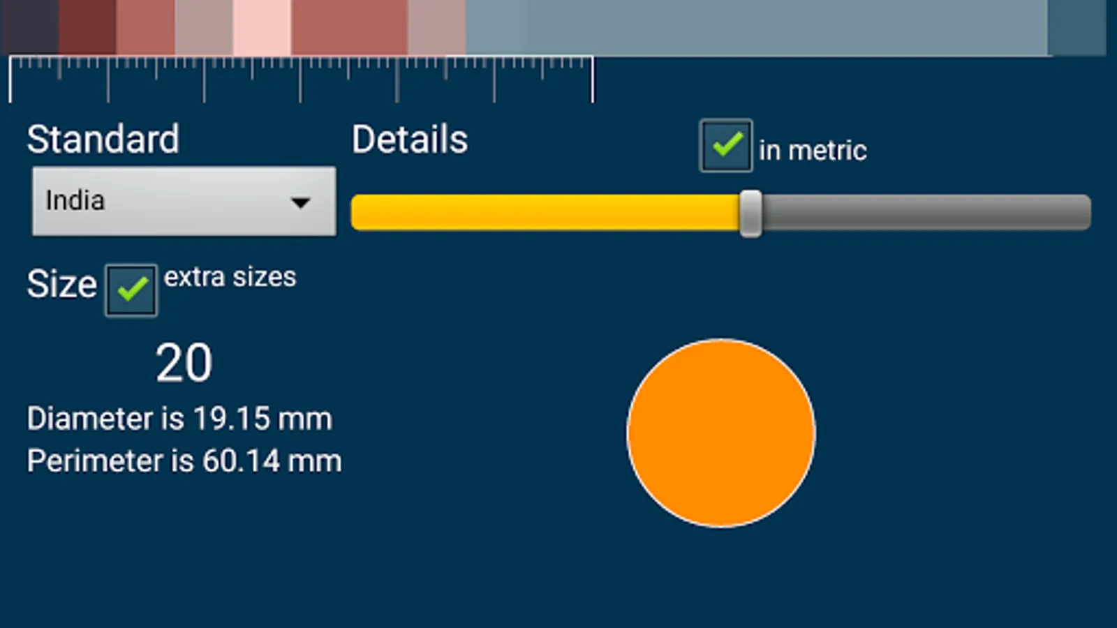 This measure will be shown in three different values internal perimeter length, internal diameter and the actual size in the selected standard.