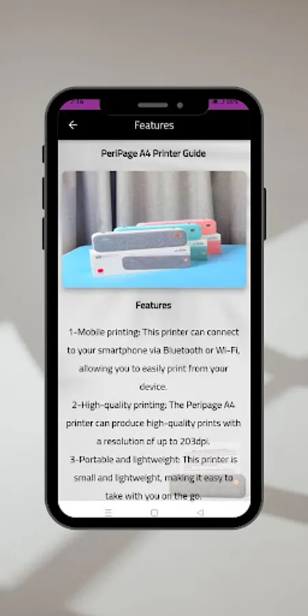 In the features section in PeriPage A4 Printer Guide app, users can discover the many capabilities of the PeriPage A4 Printer, including its thermal printing technology, high-resolution printing, and long-lasting battery life. The app also highlights the printer's compatibility with a wide range of paper types and sizes, as well as its user-friendly mobile app.