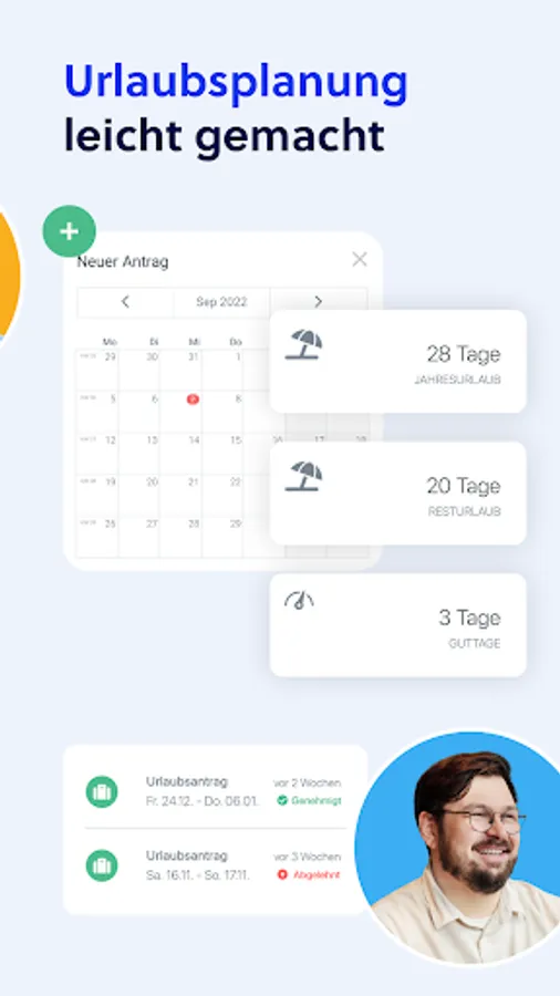 • Annual leave, carryover from the previous year, vacation taken and remaining vacation are clearly displayed. And best of all: You can send your vacation request with just one click. Incidentally, you can also keep an eye on your sick days at any time.