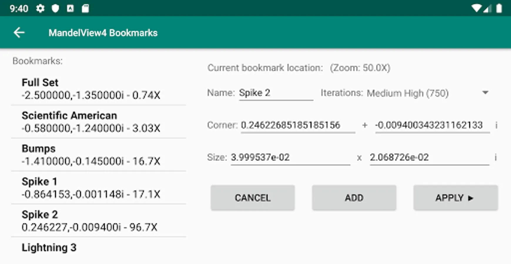 The immediate neighbourhood of the Mandelbrot Set has a boundless wealth of detail and intricacy. With MandelView4, you can enjoy that beauty wherever you go, and share particularly nice views with friends.