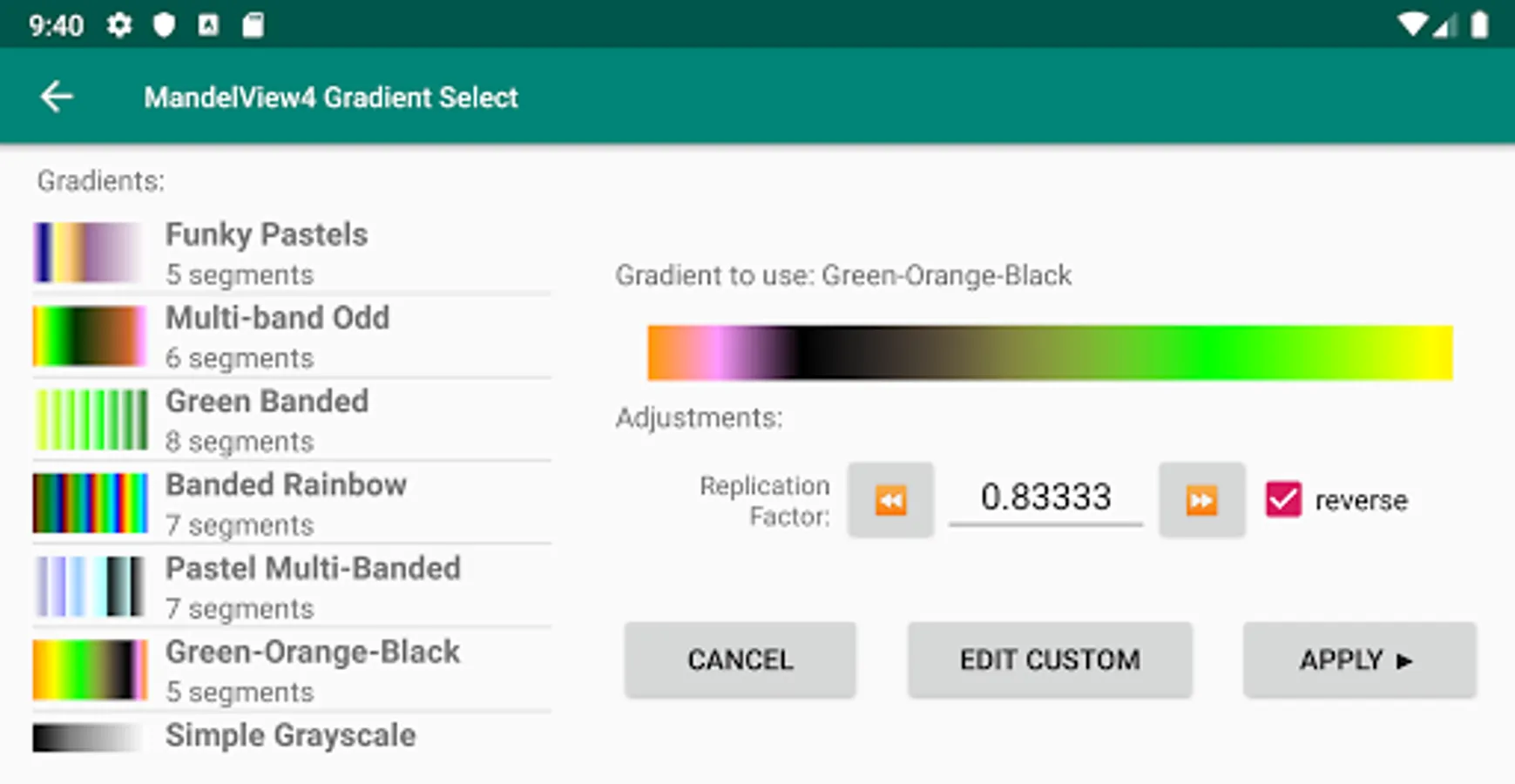 This version has over a dozen pre-defined base color schemes; the ability to define custom color gradients will be in the next version.