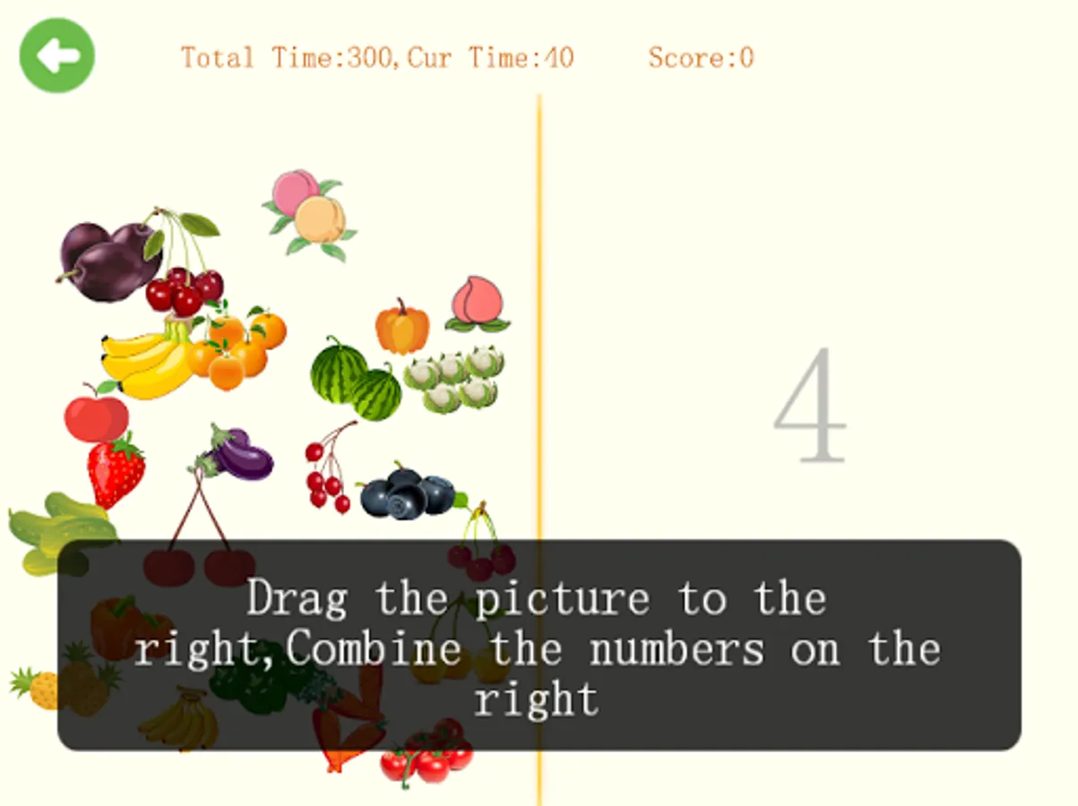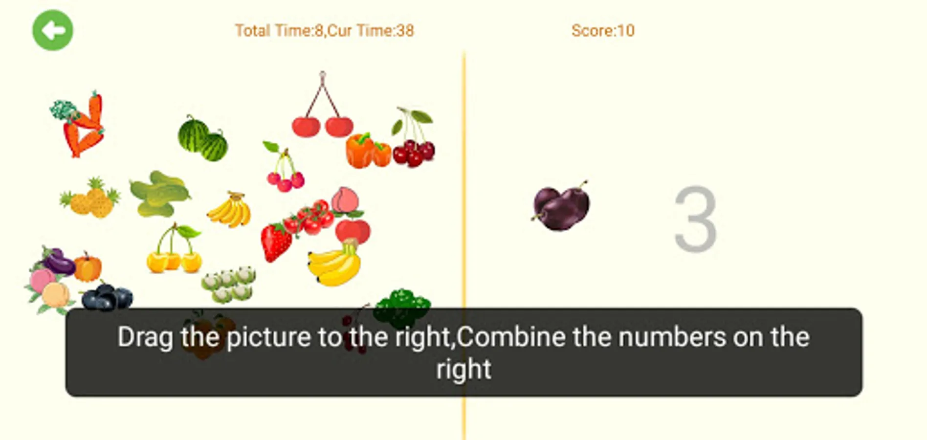 Learn the numbers from 1-50, click on each number to make a sound. In the test mode, the target number is given. Children need to drag different numbers of items to combine the target number