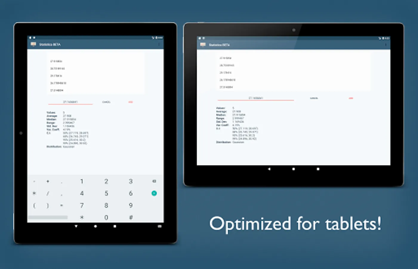 This application makes it easy to calculate the average, median, standard deviation, range, coefficient of variation, confidence intervals, etc. of a list of values.