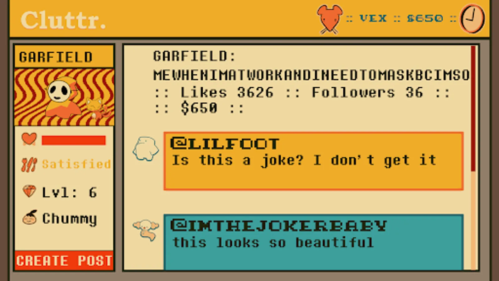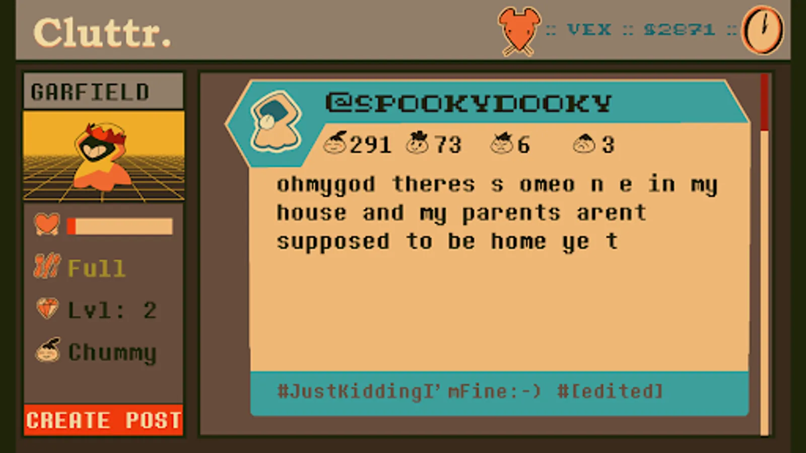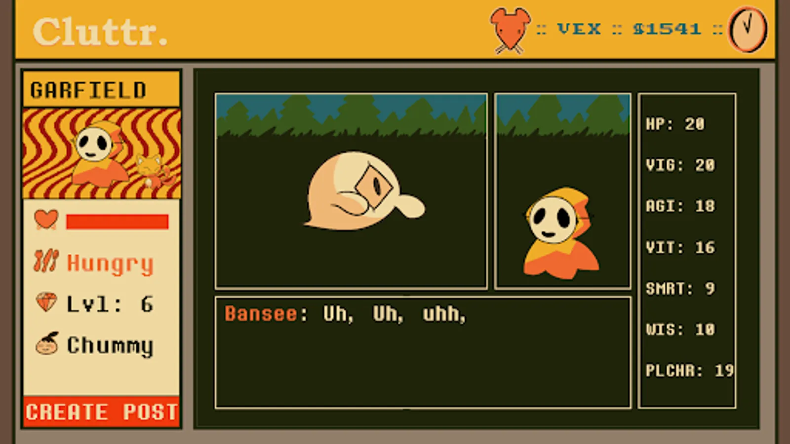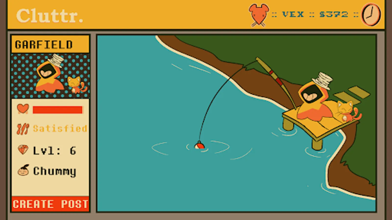 CLUTTR is a virtual pet / social media simulator game thingie! Adopt a pet ghostie goo! Dress it up and make posts on a fake social platform! There's also fishing and farming and stickers!