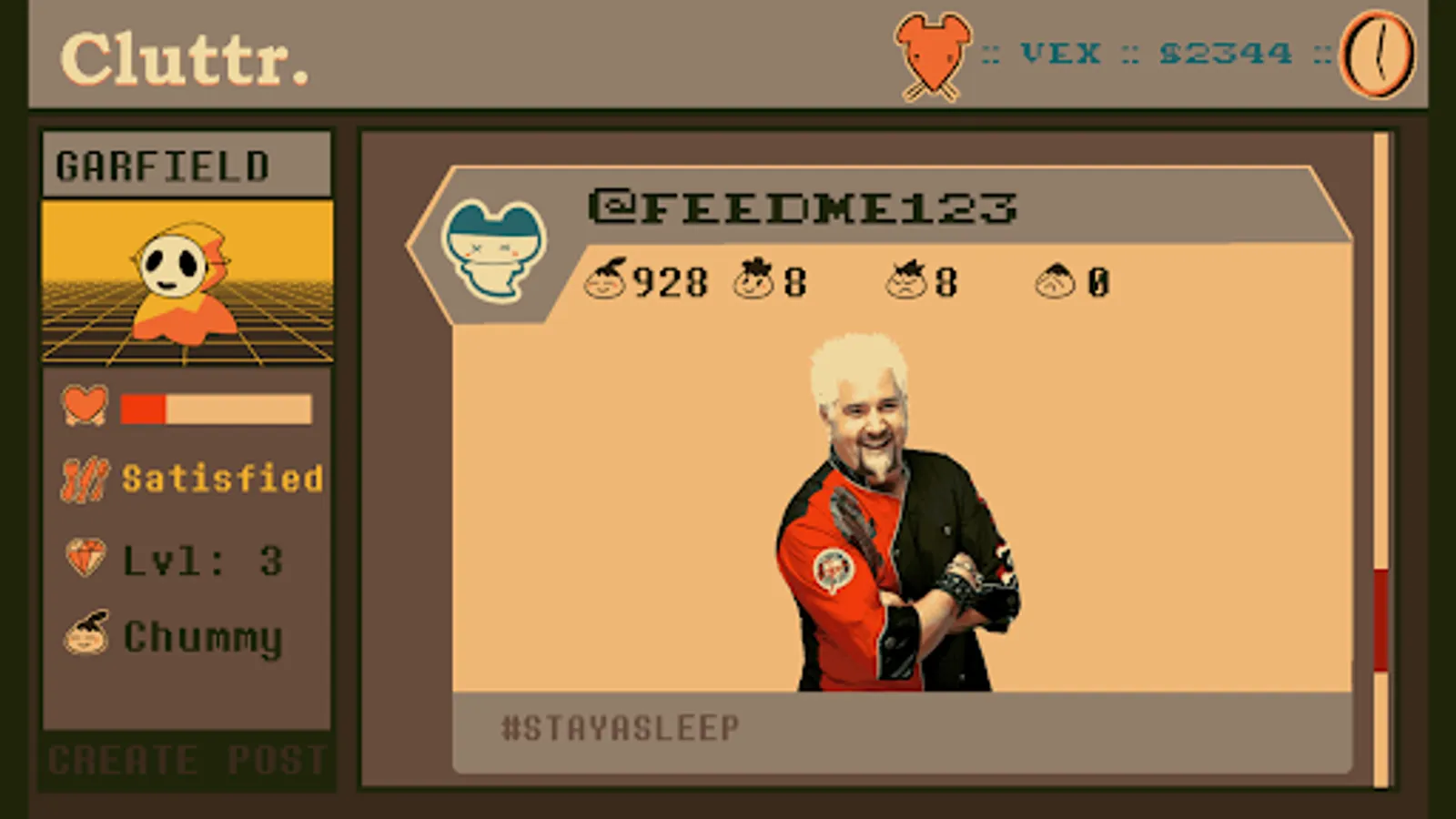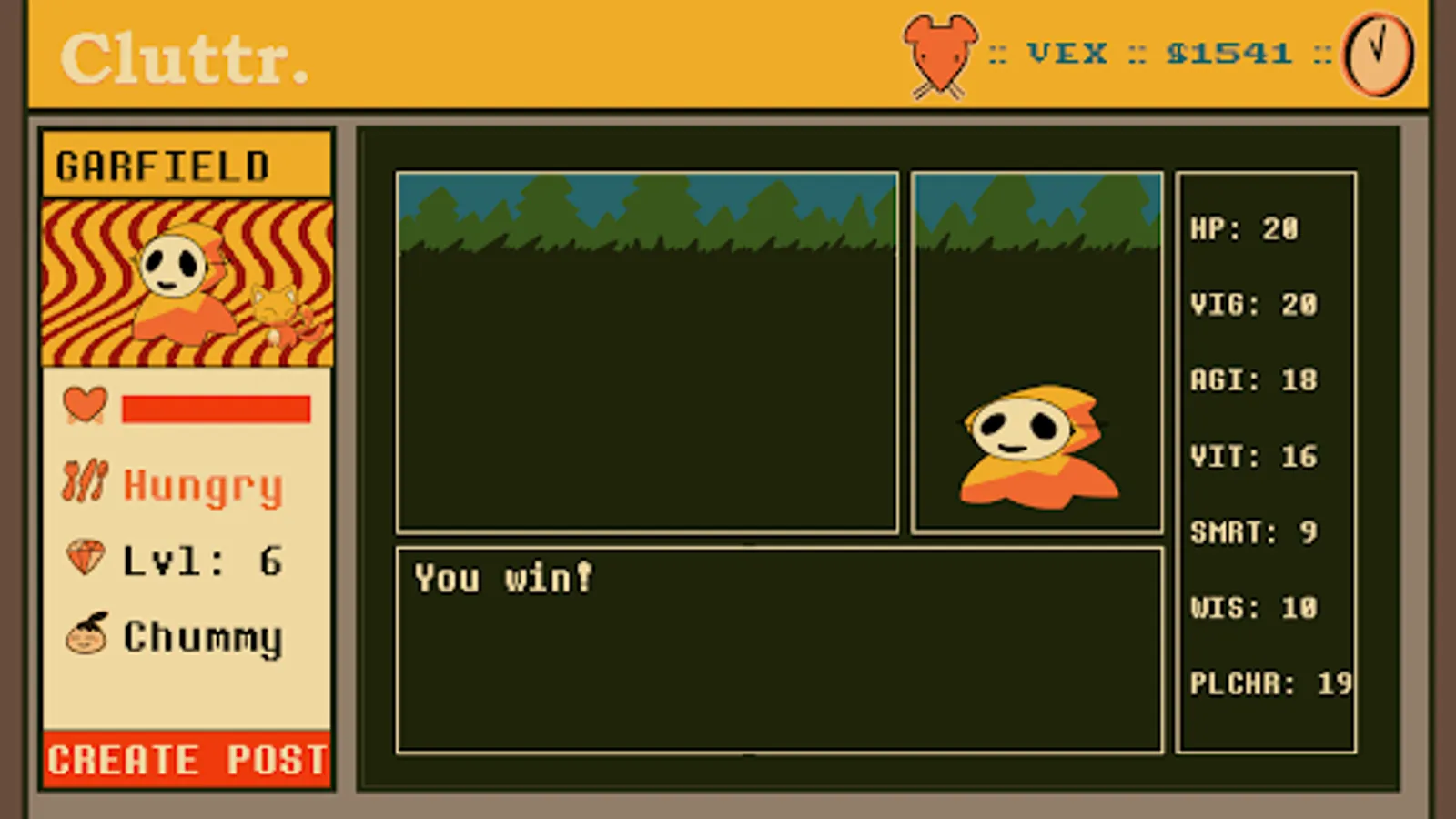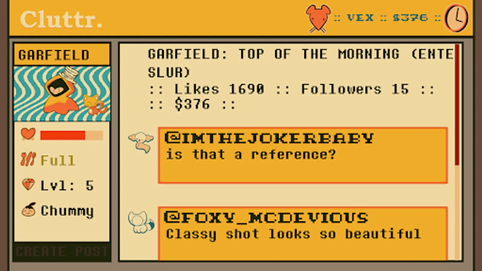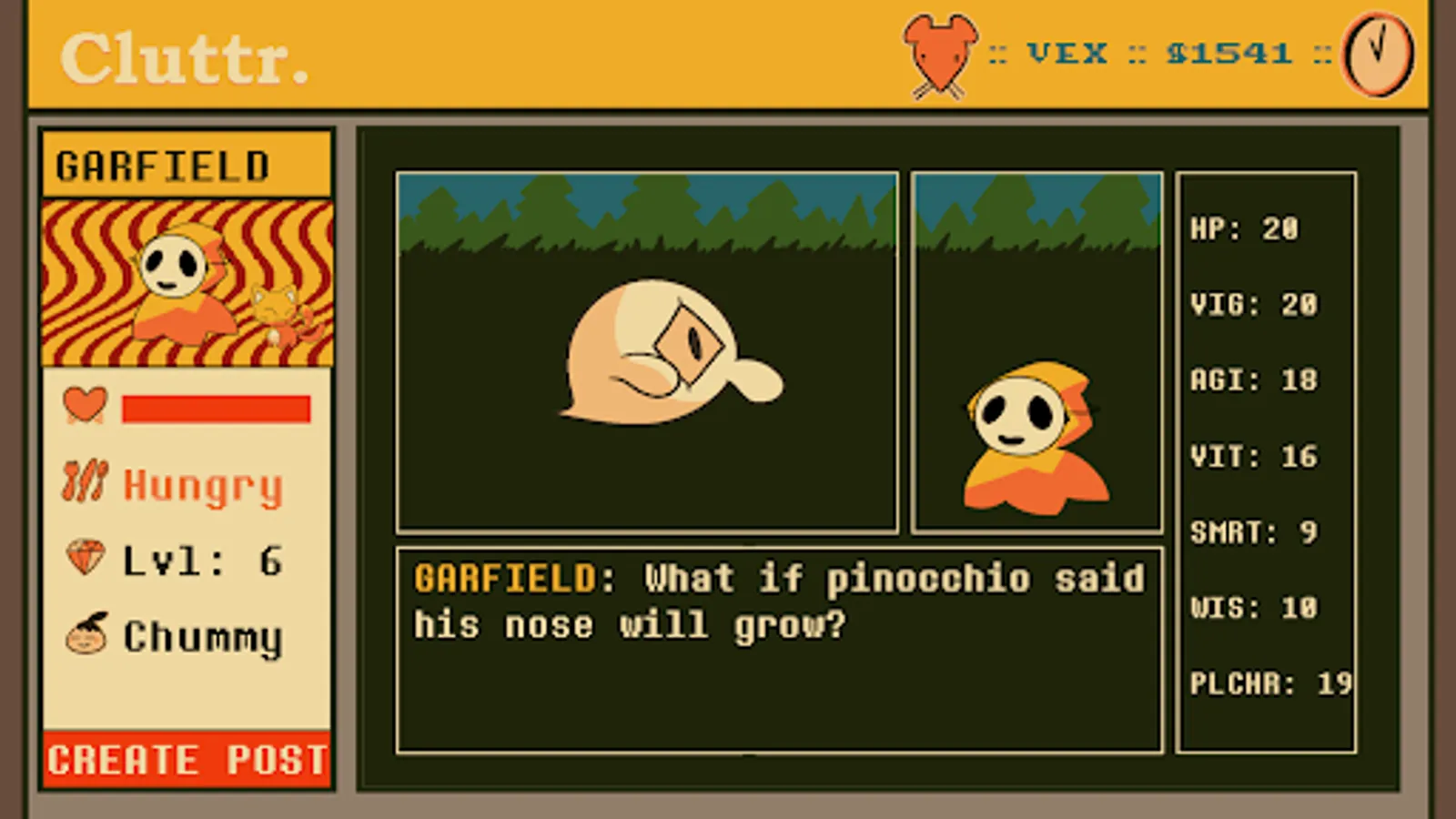 CLUTTR is a virtual pet / social media simulator game thingie! Adopt a pet ghostie goo! Dress it up and make posts on a fake social platform! There's also fishing and farming and stickers!
