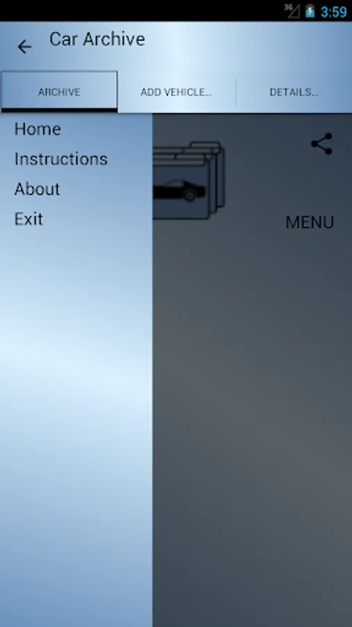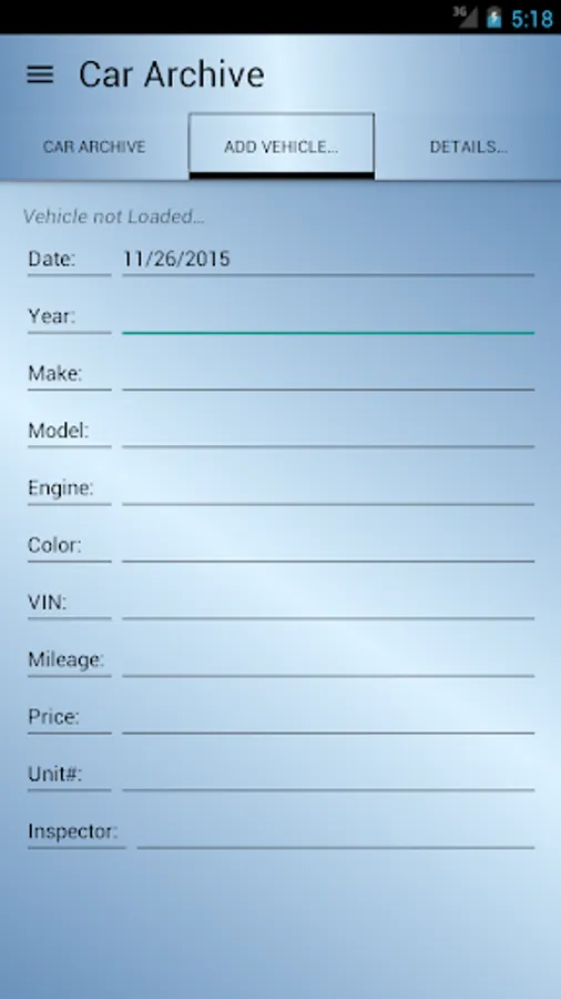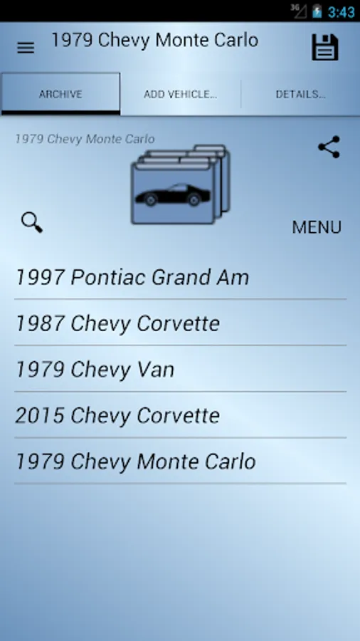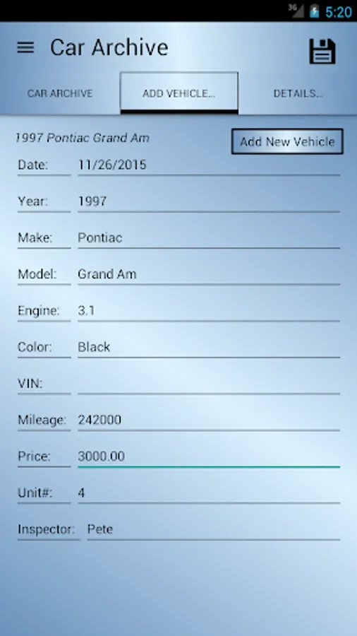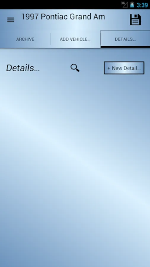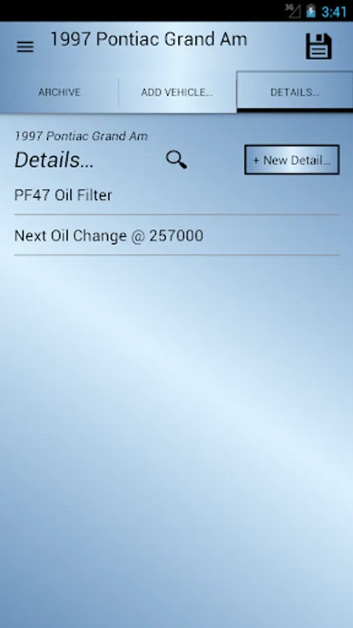 Car Archive is a handy because all of your vehicles and information you stored for is able to be accessed quickly! There are only three pages on swiped views, the Archive page which lists the vehicles you entered, the Add Vehicle page where you add vehicles and view the main information and the Details page where the details that you enter for each vehicle are stored.