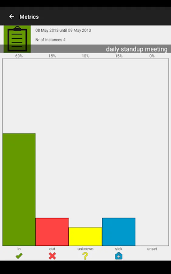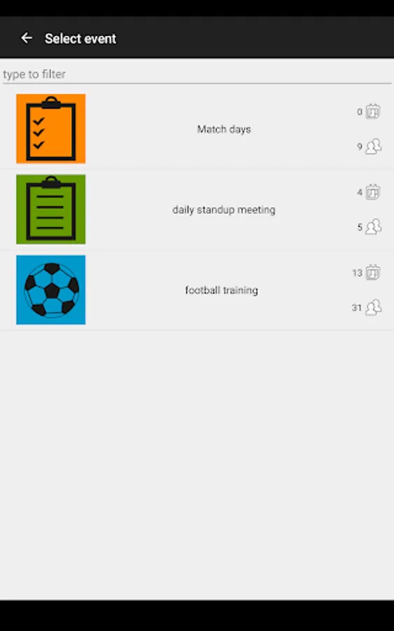 • Define events, assign participants to the event (from your Google account contacts) and track if persons are in, out, sick or unknown.