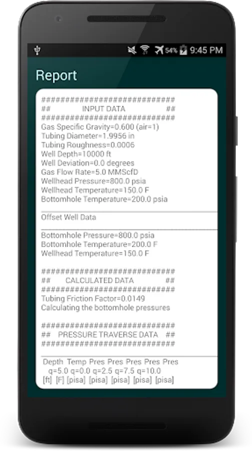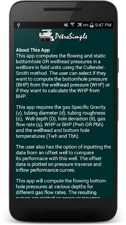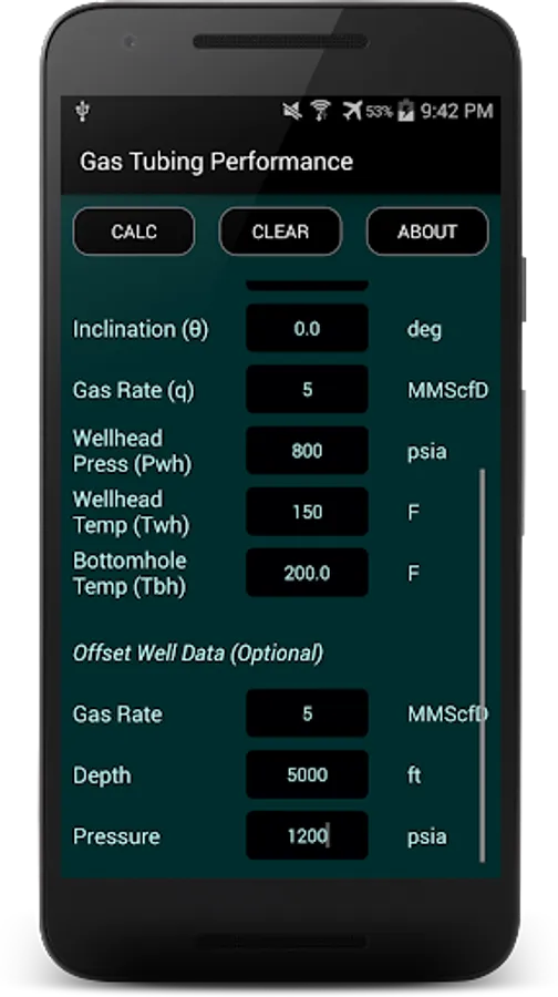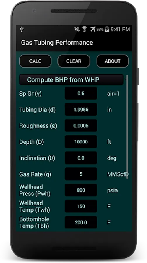 This app requires the gas Specific Gravity (γ), tubing diameter (d), tubing roughness (ε), Well depth (D), hole deviation (θ), gas flow rate (q), WHP or BHP (Pwh OR Pbh) and the wellhead and bottom hole temperatures (Twh and Tbh).