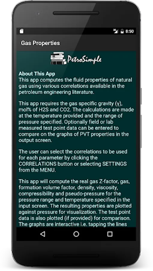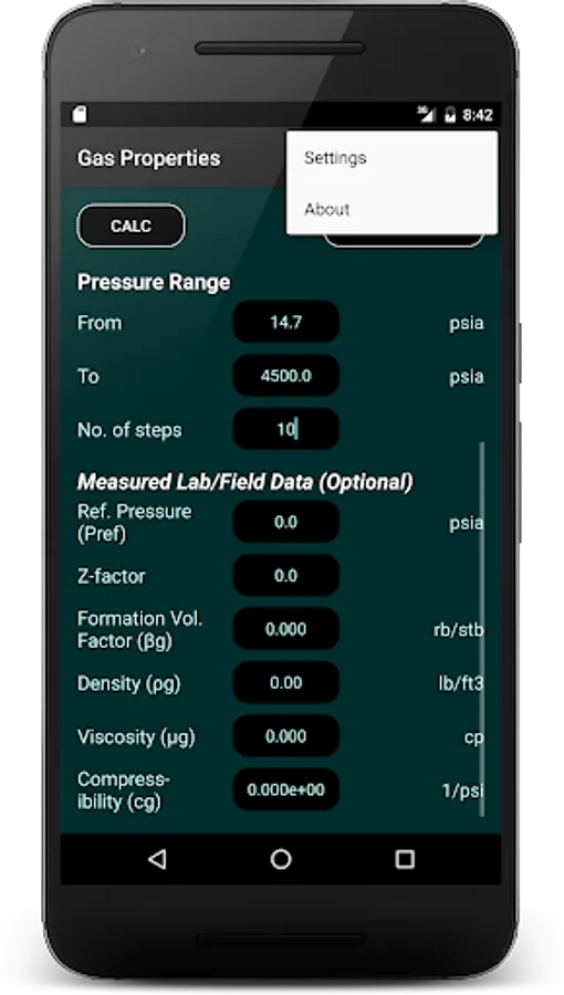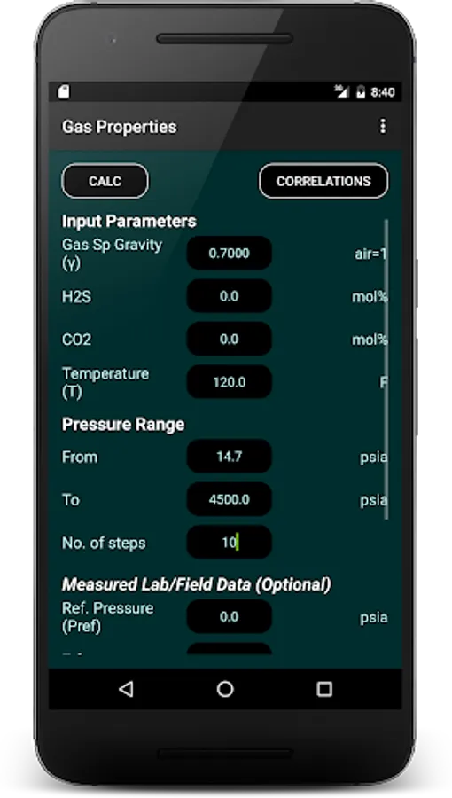 This app requires the gas specific gravity (γ), mol% of H2S and CO2. The calculations are made at the temperature provided and the range of pressure specified. Optionally field or lab measured test point data can be entered to compare on the graphs of PVT properties in the output screen.