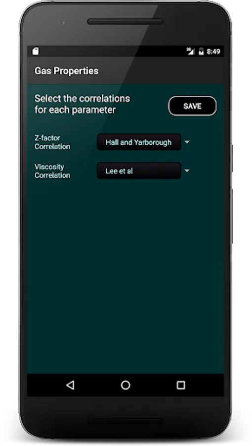 The user can select the correlations to be used for each parameter by clicking the CORRELATIONS button or selecting SETTINGS from the MENU.