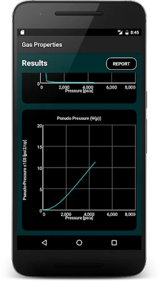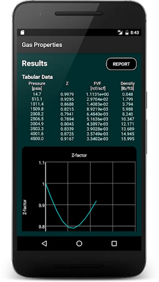 This app will compute the real gas Z-factor, gas, formation volume factor, density, viscosity, compressibility and pseudo-pressure for the pressure range and temperature specified in the input screen. The resulting properties are plotted against pressure for visualization. The test point data is also plotted (if provided) for comparison. The graphs are interactive i.e. tapping the lines pops out the values of that point.