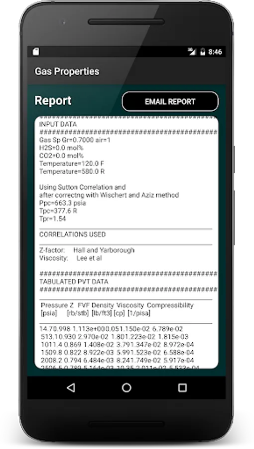 Finally a report of the calculation is also available in copyable tab delimited text form to paste into a mobile word processor. Clicking the "EMAIL REPORT" button launches the default Android mail app with the report in the body of the email.