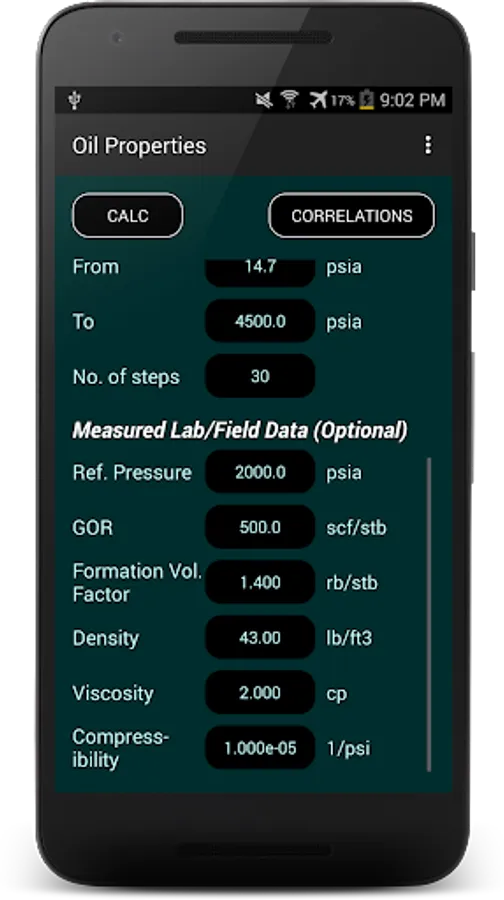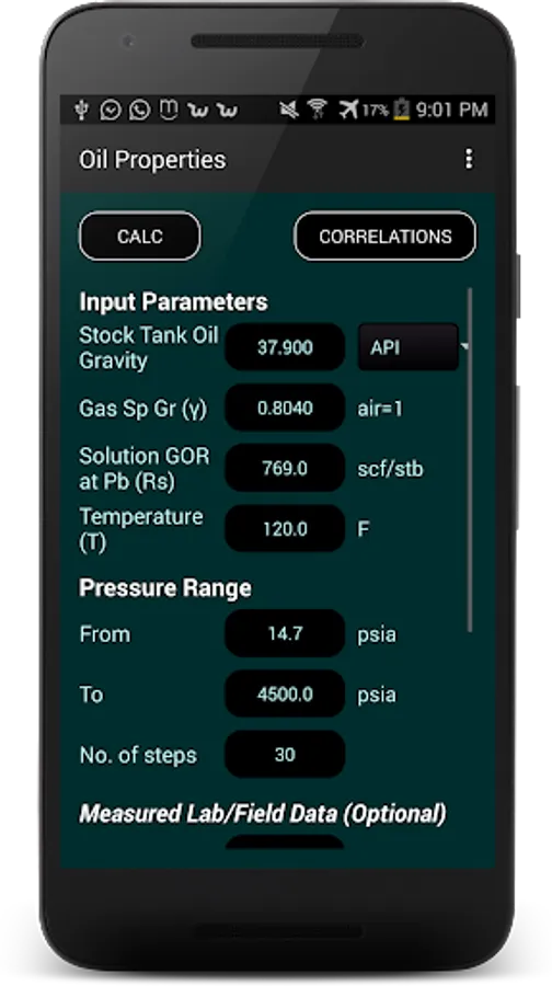 This app requires the Stock Tank Oil Gravity; user has the option to specify the units of STO gravity, Gas Specific Gravity (γ), Solution Gas Oil Ratio at Bubble Point Pressure (Rs) and Temperature (T) at which the PVT properties are sought. The user then selects the range of pressure for which the PVT properties are to be calculated with a maximum number of steps set to 30 (default). Optionally a field or lab measured test point data can be entered to compare on the graphs of PVT properties in the output screen.