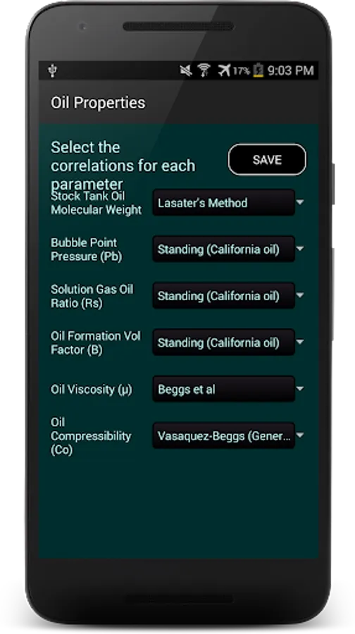 The user can select the correlations to be used for each parameter by clicking the CORRELATIONS button or selecting SETTINGS from the MENU.