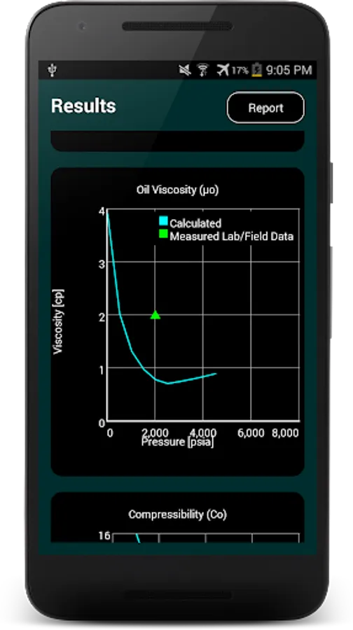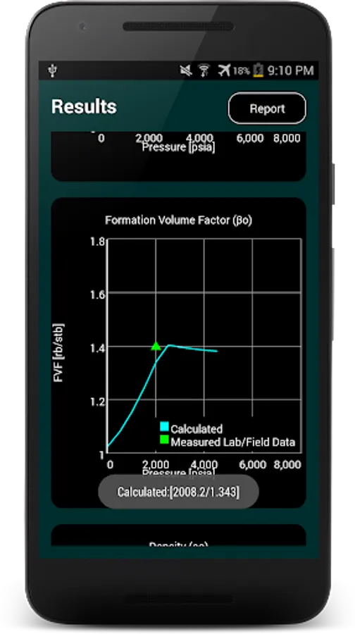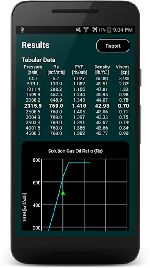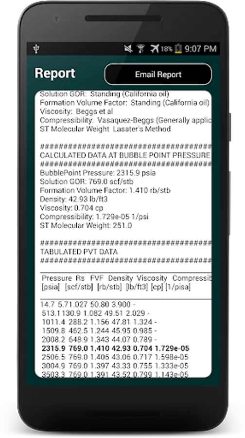This app will compute the solution gas oil ratio, formation volume factor, density, viscosity and compressibility at the pressure range and temperature specified in the input screen. The resulting properties are plotted against pressure for visualization. The test point data is also plotted (if provided) for comparison. The graphs are interactive i.e. tapping the lines pops out the values of that point.