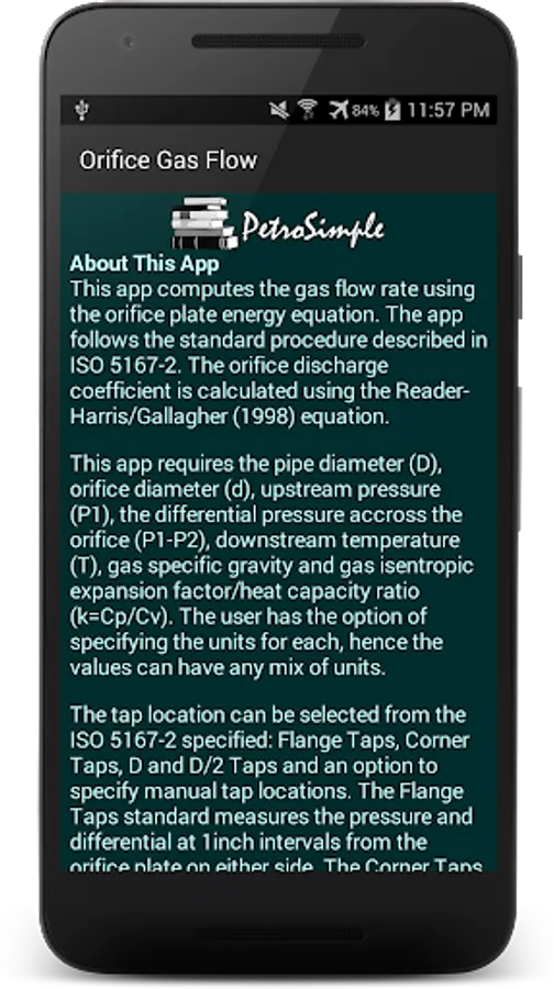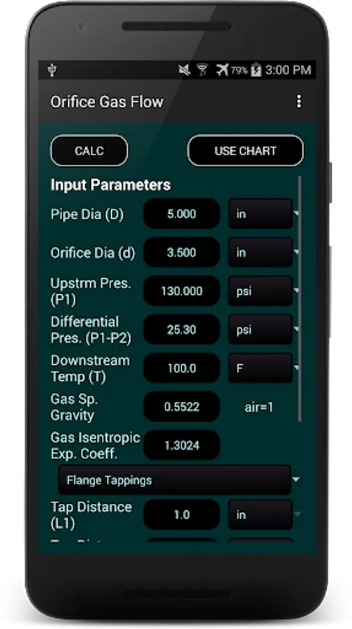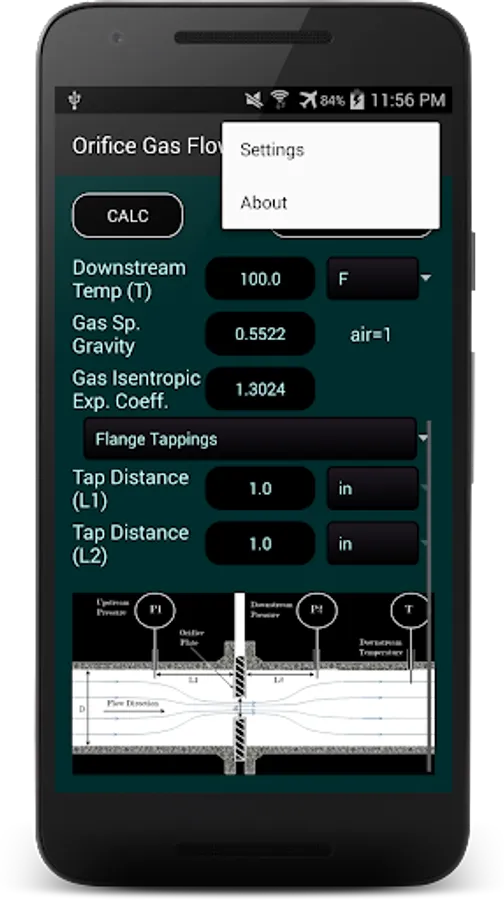 This app requires the pipe diameter (D), orifice diameter (d), upstream pressure (P1), the differential pressure across the orifice (P1-P2), downstream temperature (T), gas specific gravity and gas isentropic expansion factor/heat capacity ratio (k=Cp/Cv). The user has the option of specifying the units for each, hence the values can have any mix of units.