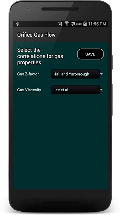 The correlations for computing Z-factor and viscosity can be changed by selecting SETTINGS from the MENU. It is also possible to use the Square Root Circular Flow Recorder Chart readings by first converting them. The app can convert the chart readings by clicking the "USE CHART" button. The readings can be converted as well as substituted for pressure, differential pressure and temperature for onward calculation of gas flow rate.