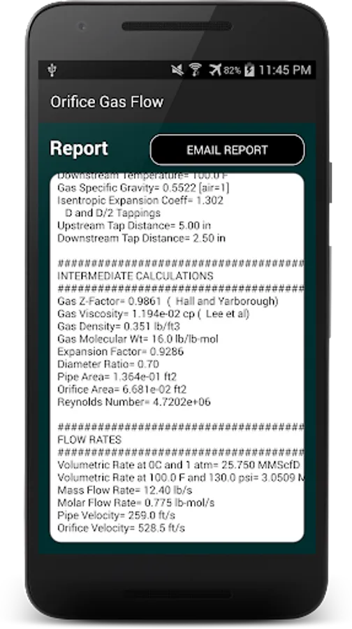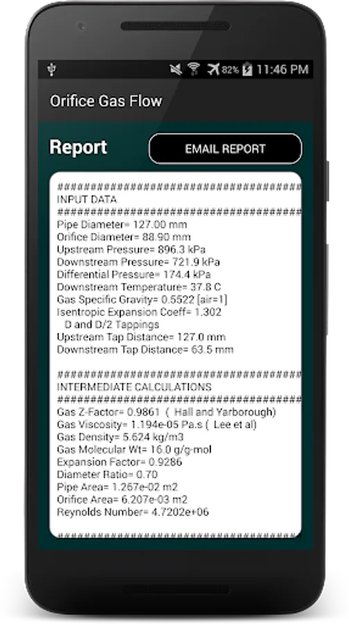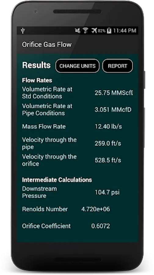 The results of calculation are displayed in SI/Filed units. This app computes the volumetric gas flow rate at standard conditions of 60F and 14.7 psia for field units and 0C and 1 atmosphere for SI units. The volumetric gas rate at pipe upstream conditions, mass flow rate and velocities through the pipe and orifice are also computed. The intermediate calculations are also displayed for reference, such as Reynolds number, orifice coefficient, gas Z-factor and gas viscosity. More detailed intermediate values are displayed in the text only report. The units can be switched between field and SI units by clicking the "Change Units" button.