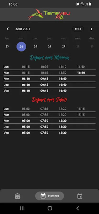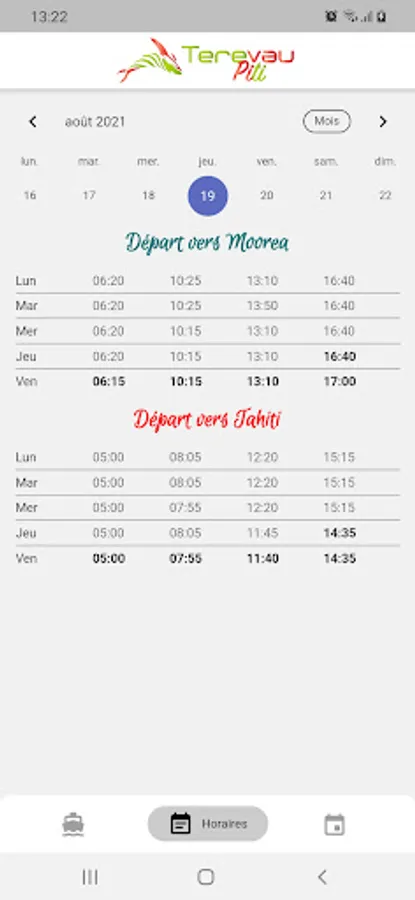 - Consult the timetables for the Tahiti Moorea service all year round, organized by week.
