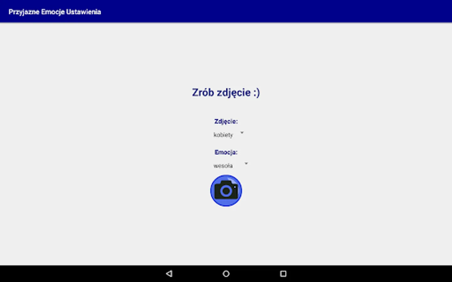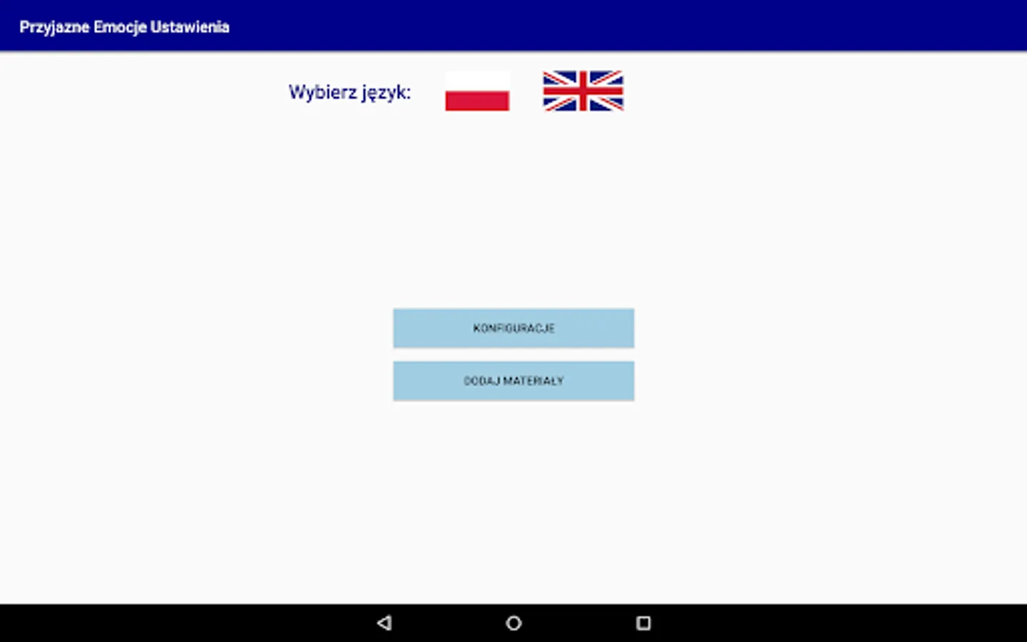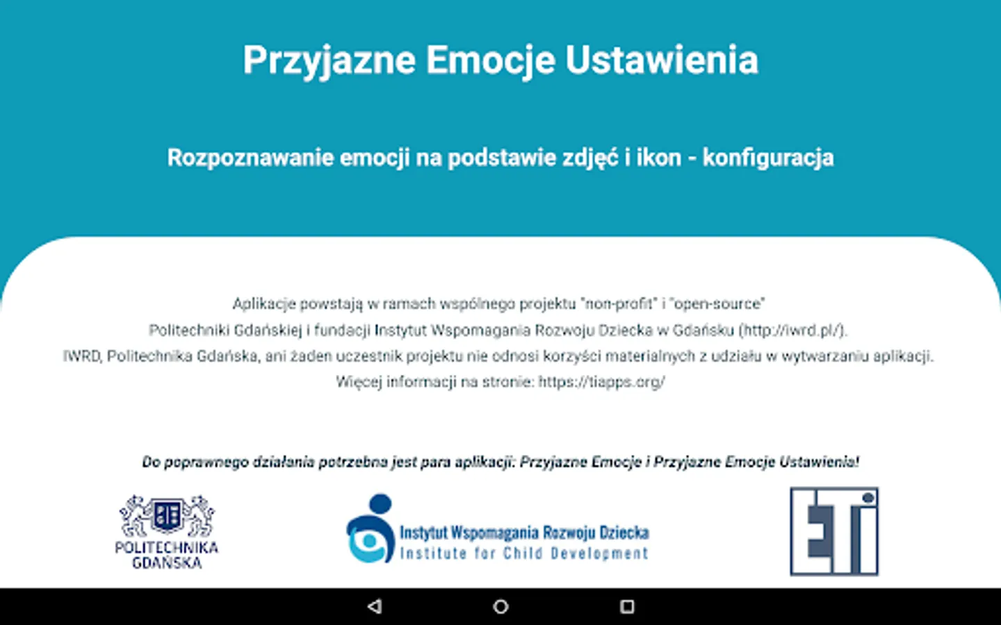 The application is part of the Friendly Applications project supporting behavioral therapy for children with autism. Friendly emotions support the training of the child's emotional intelligence in recognizing and naming emotions based on a photo or an icon. Two applications are needed for the correct operation of the solution: Friendly Emotions and Friendly Emotions Settings. The first one is intended for a child to whom photos are displayed along with the instruction to choose the one that corresponds to the indicated emotion. The app includes buffs and hints. The second application, Friendly Emotions Settings, is used to configure the child's gameplay - it is possible to adjust the number and type of emotions trained, response time, command type and amplification type. Applications implement the extracted sample method.