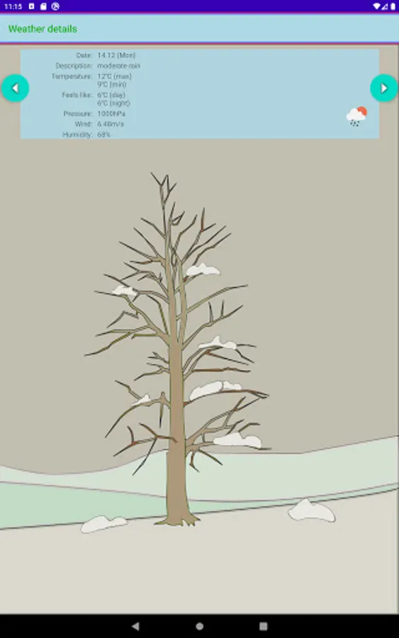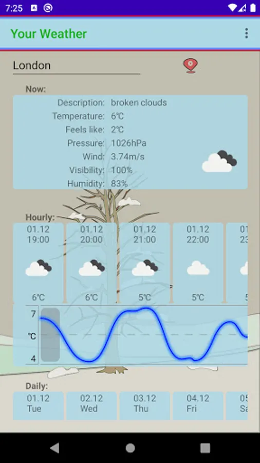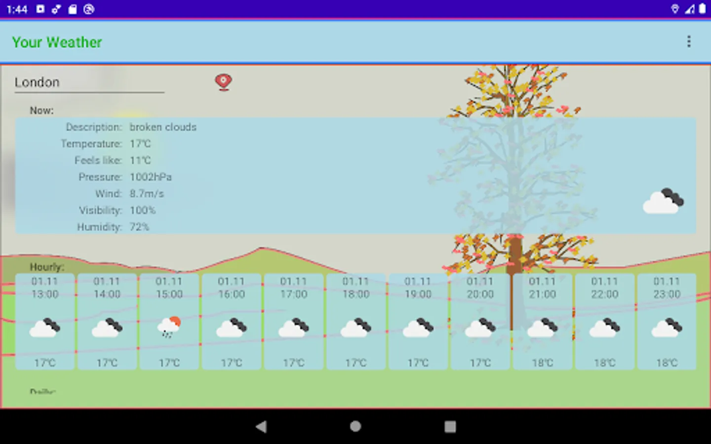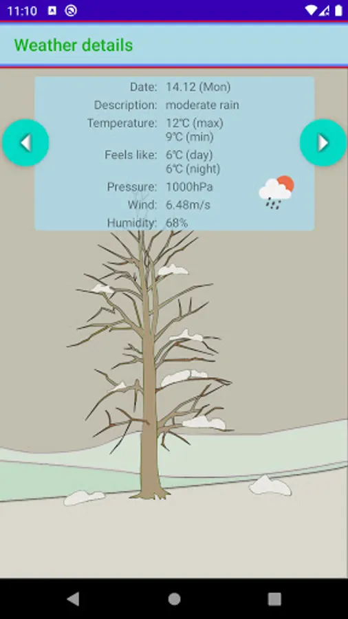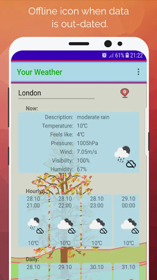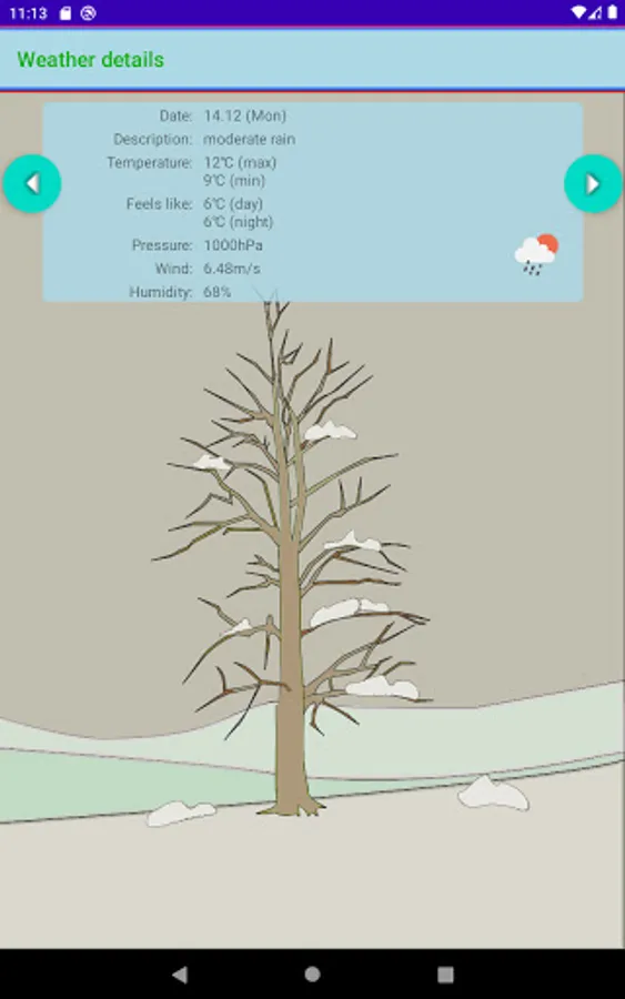 - Caching results and icons. It is possible to get weather forecast for 2 days even without Internet access.
