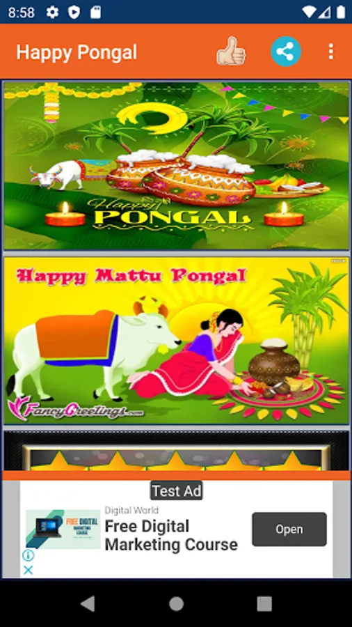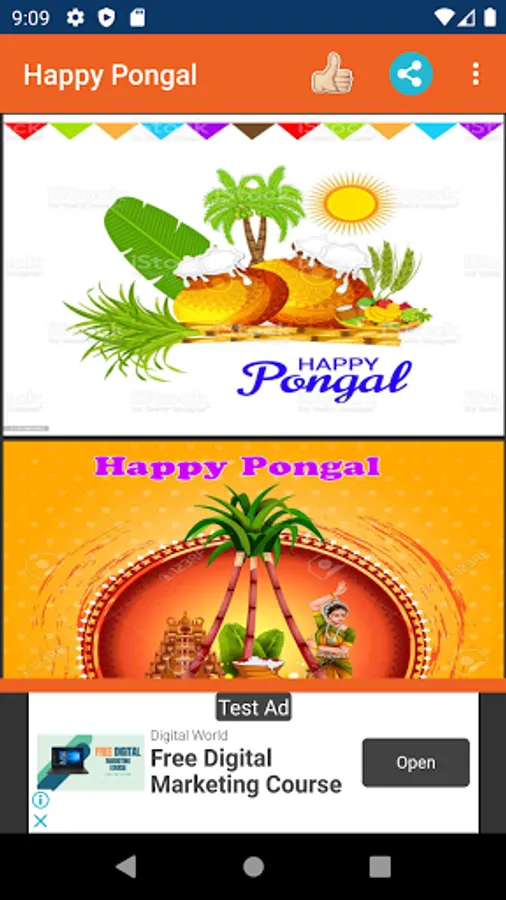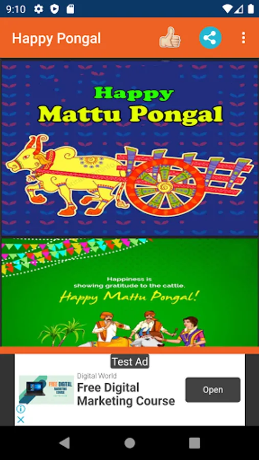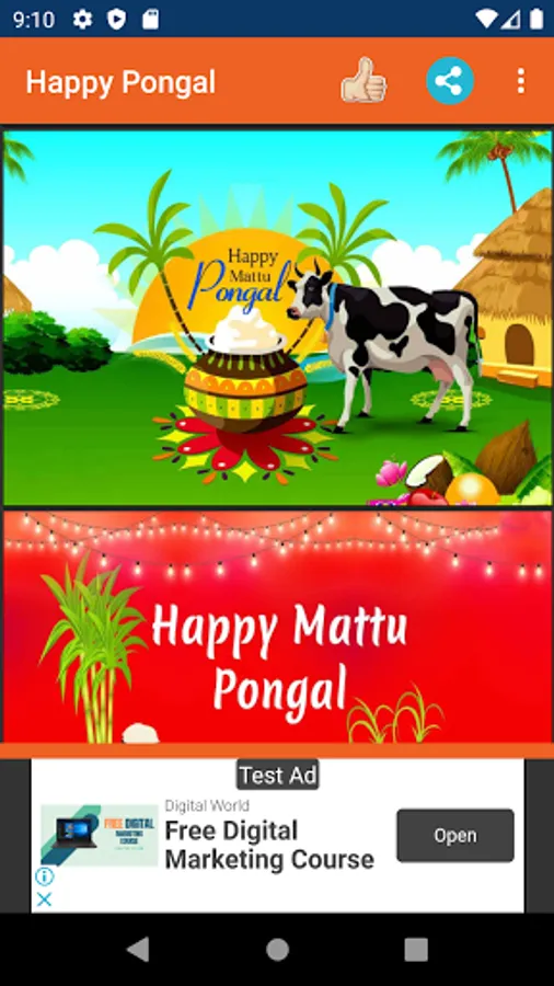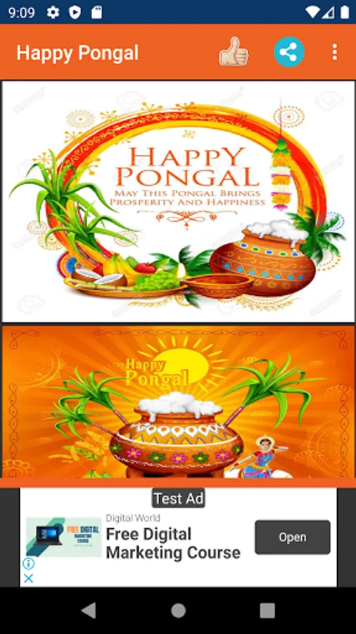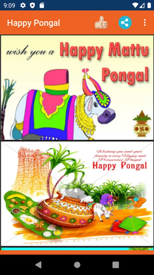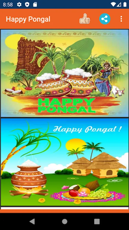 Pongal is national level big festival which is celebrated by the indian people especially tamil people with full of happiness. You can find the beautiful collection of Thai Pongal Greetings and Mattu Pongal Pictures with nice background. This free app is an utility for sending beautiful collection of "Pongal Wishes" greetings to your family and friends quickly via social messengers such as whatsapp, facebook, twitter, etc,. Internet connection is required only when you want to share any image / image as whatsapp profile / status messages with others. This app also lets you to set an image as your phone smart wallpapers.