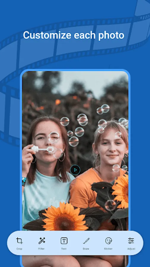 With Video maker of photos with music & video editor, creating videos with photos, music, and more is attractive and fun. You can make your video with text, effects, stickers, photo filters, transitions, sound effects and almost anything you want in a creative way to have interesting video.
