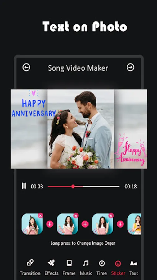Dont't miss special moments and clicks of celebration and create video easily with few steps with help of Music video maker. You can make video with pictures and music from gallery.Music Video Maker very easy to use.You can arrange the photos in order with the perfect background, music and animation to create a video of your own.