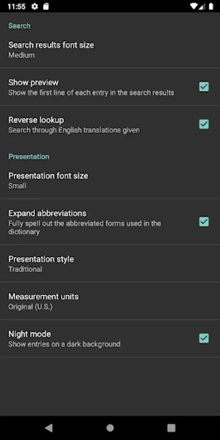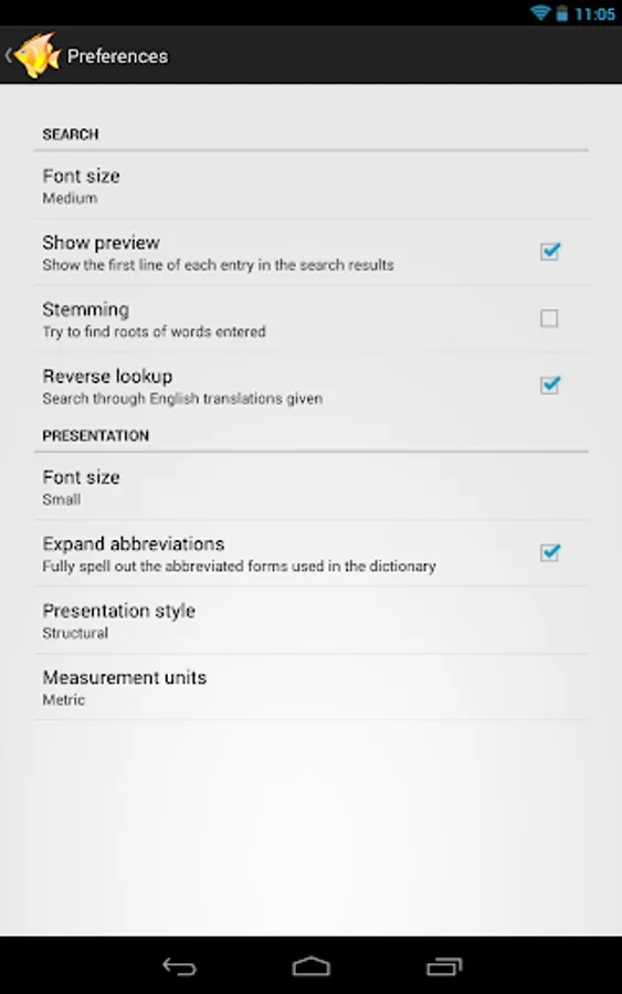 The app provides a fast searchable interface, structured formatting of entries, and allows reverse look-ups to a limited extend. It can be used off-line, as all dictionary data is stored on our device.