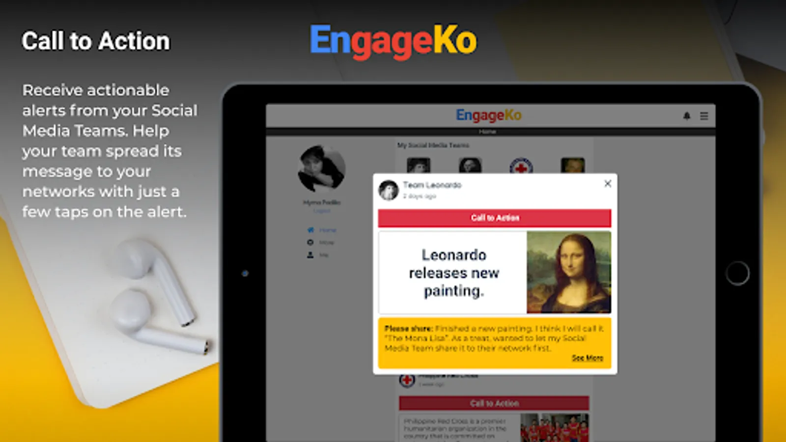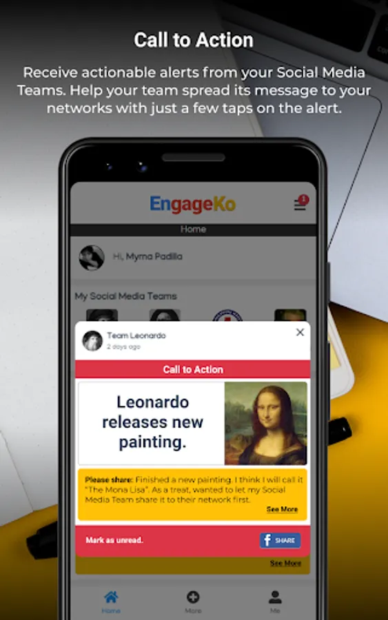 Call to Action - Receive actionable alerts from your Social Media Teams. Help your team spread its message to your networks with just a few taps on the alert.