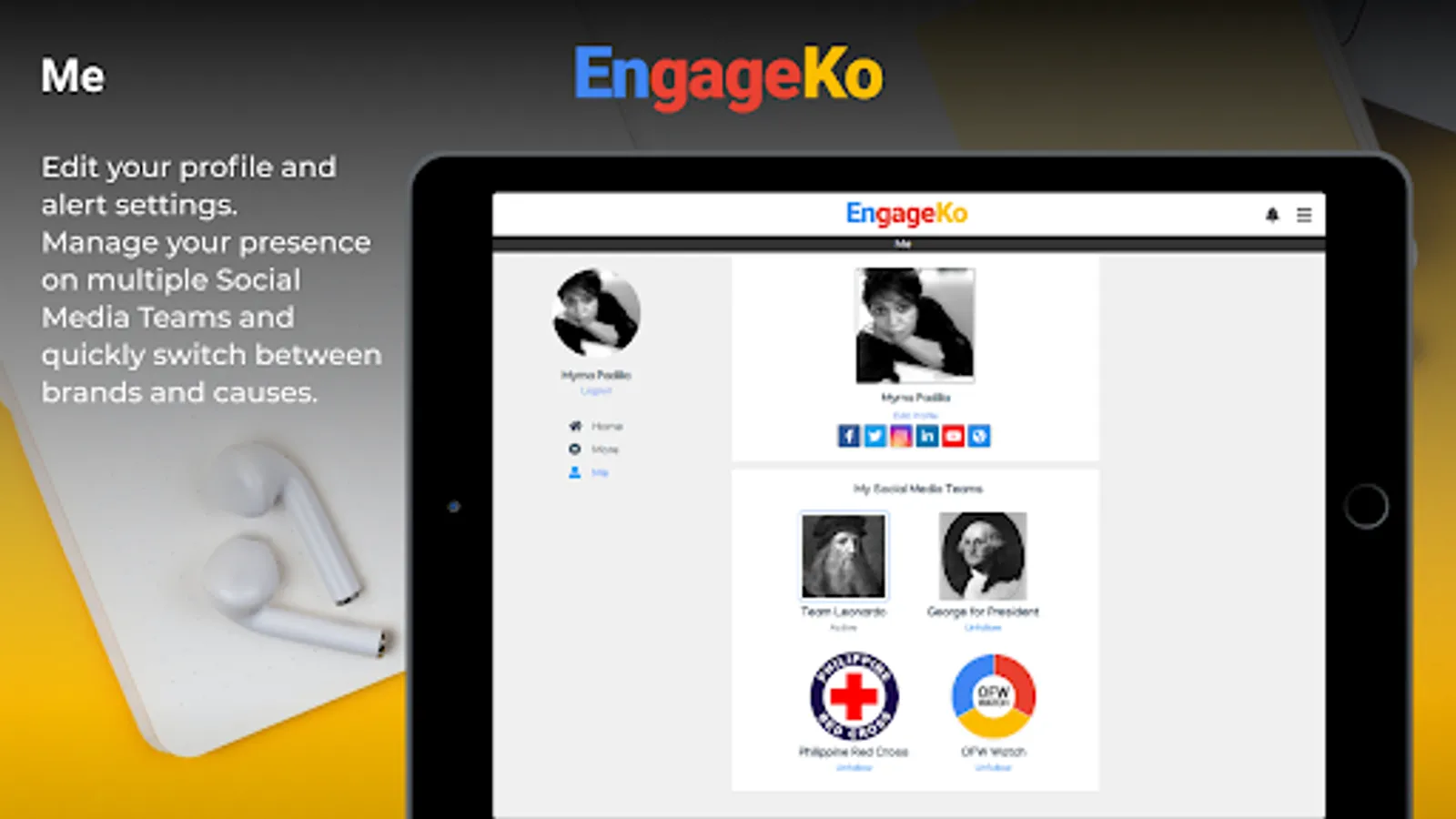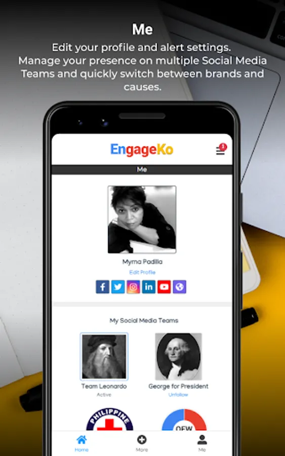 Manage your presence on multiple Social Media Teams and quickly switch between brands and causes.