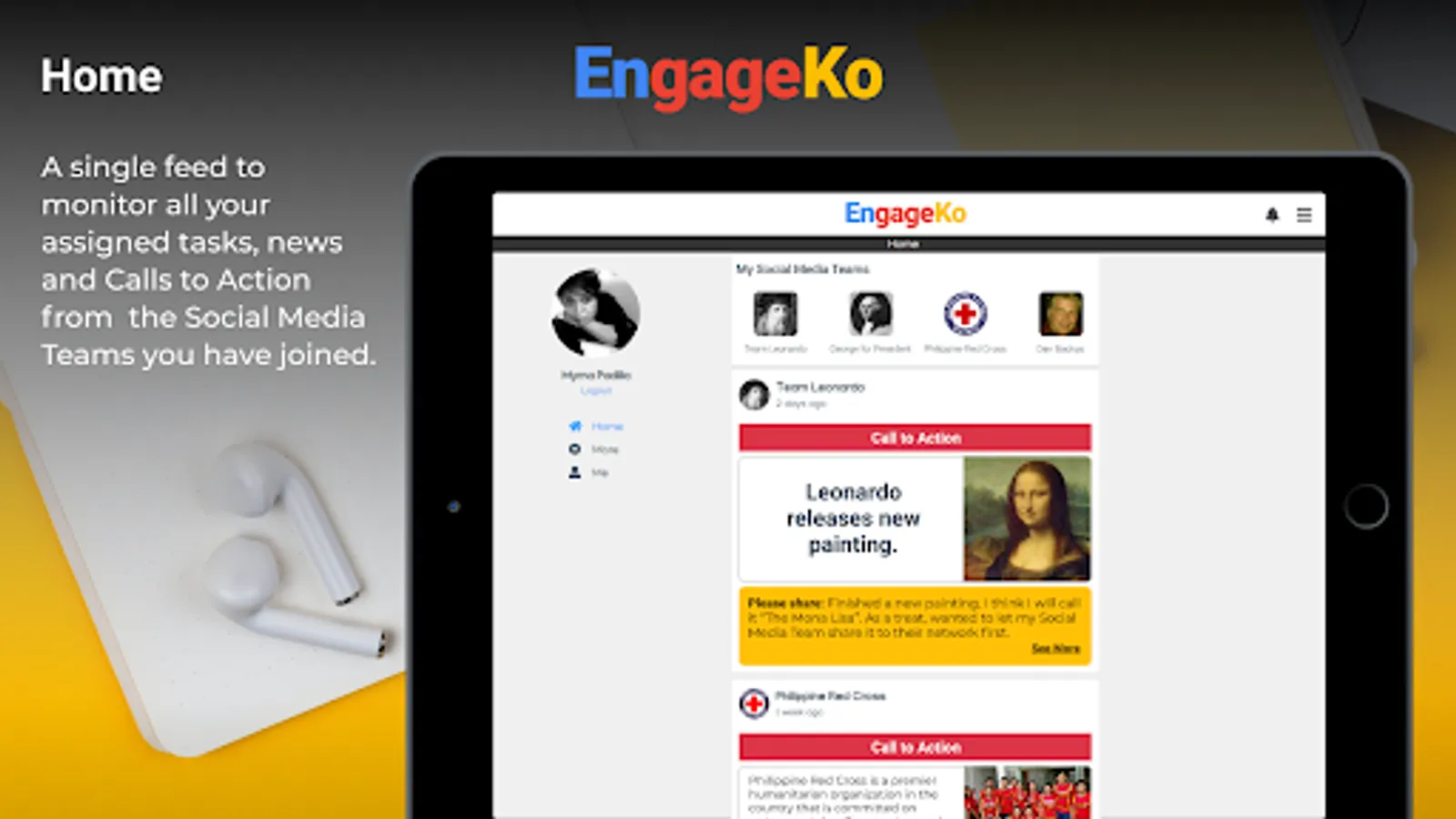 Home - A single feed to monitor all your assigned tasks, news, and Calls to Action from the Social Media Teams you have joined.