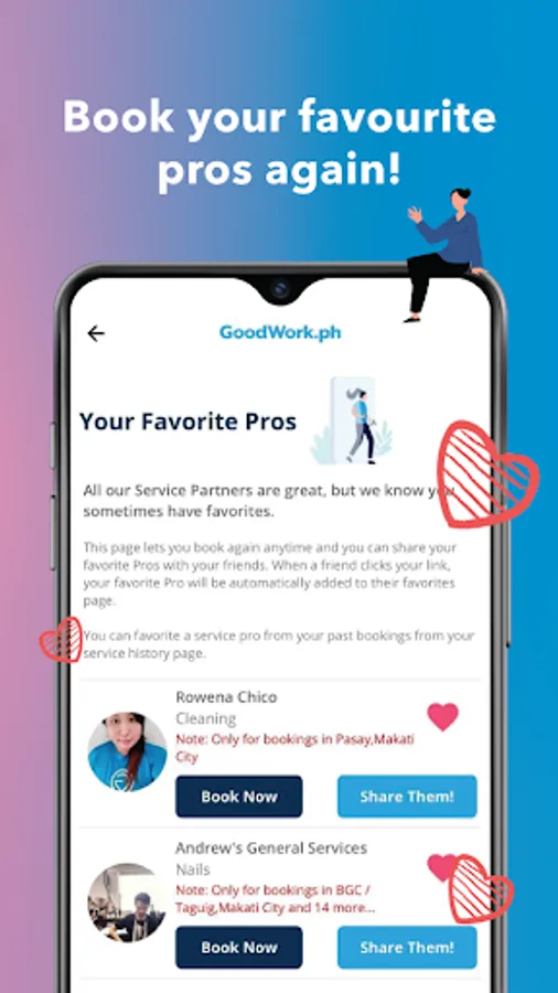 - Share GoodWork with a friend and earn rewards faster. Your friend gets 100 pesos off when they use your referral code to book a service!