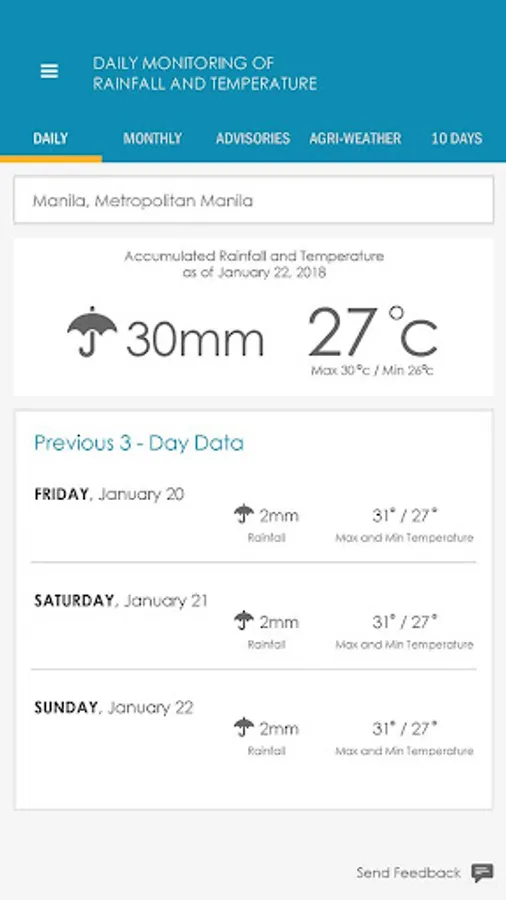 This displays the rainfall and temperature for a specific municipality. It also shows the accumulated data for the past 3-days.