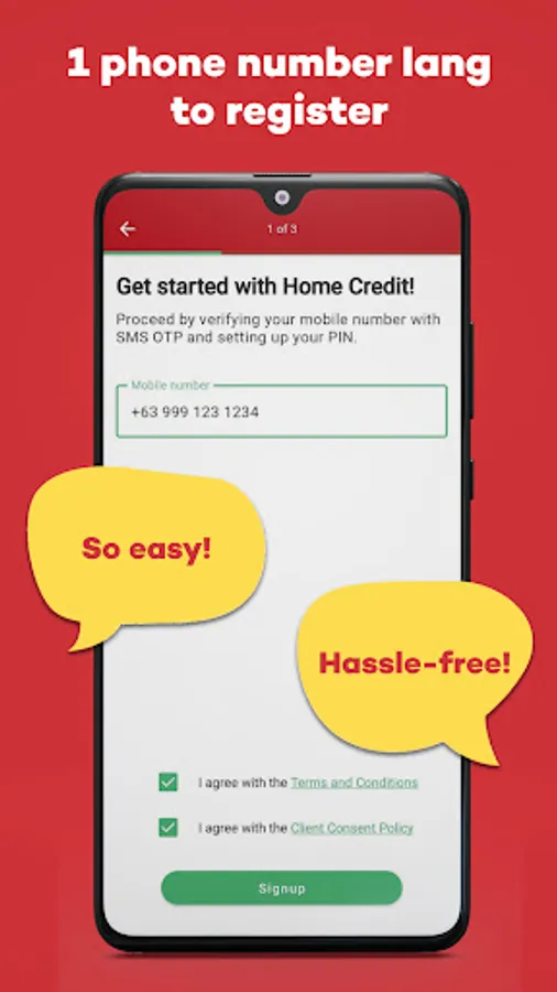Get up to 150,000 in cash loans that you can repay within 6 to 60 months, starting at 18% up to 96% Annual Percentage Rate (APR). Only one ID is needed to apply, and cash can be claimed in as fast as one minute. Enjoy hassle-free and fast processing times with the Home Credit online loan app.