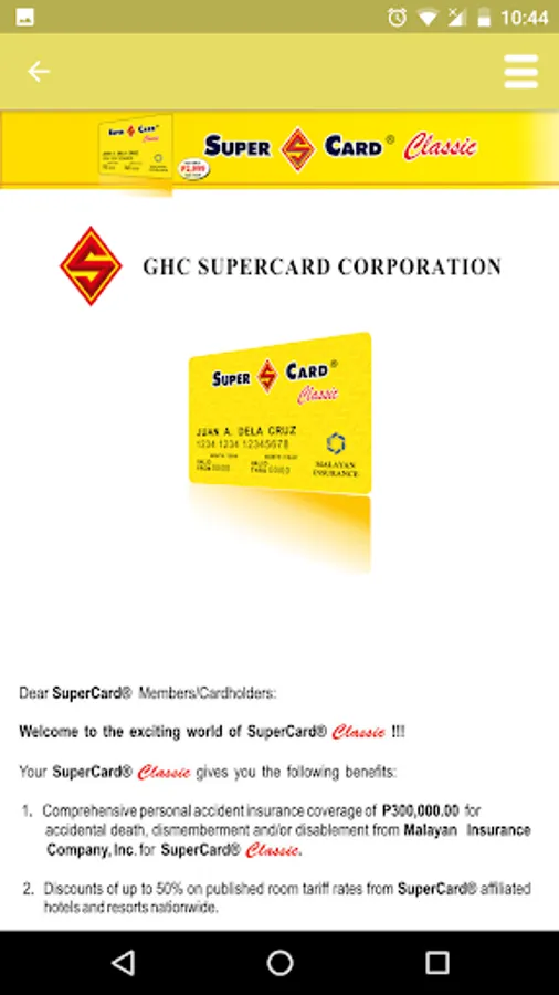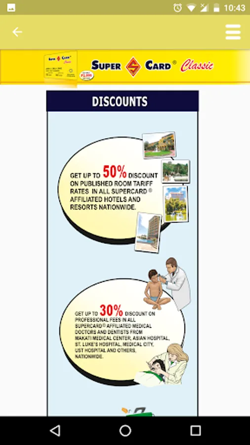 Super Card is a Discount and Personal Accident Insurance Card. Supercard provides discounts from several affiliated resorts and hotels nationwide as well as affiliated medical doctors and dentists nationwide. In addition, Supercard provides comprehensive Personal Accident Insurance to each card holder providing protection against accidental death, dismemberment, or disablement with personal accident insurance coverage ranging from P300,000.00 to P1,000,000.00 depending of the type of card.