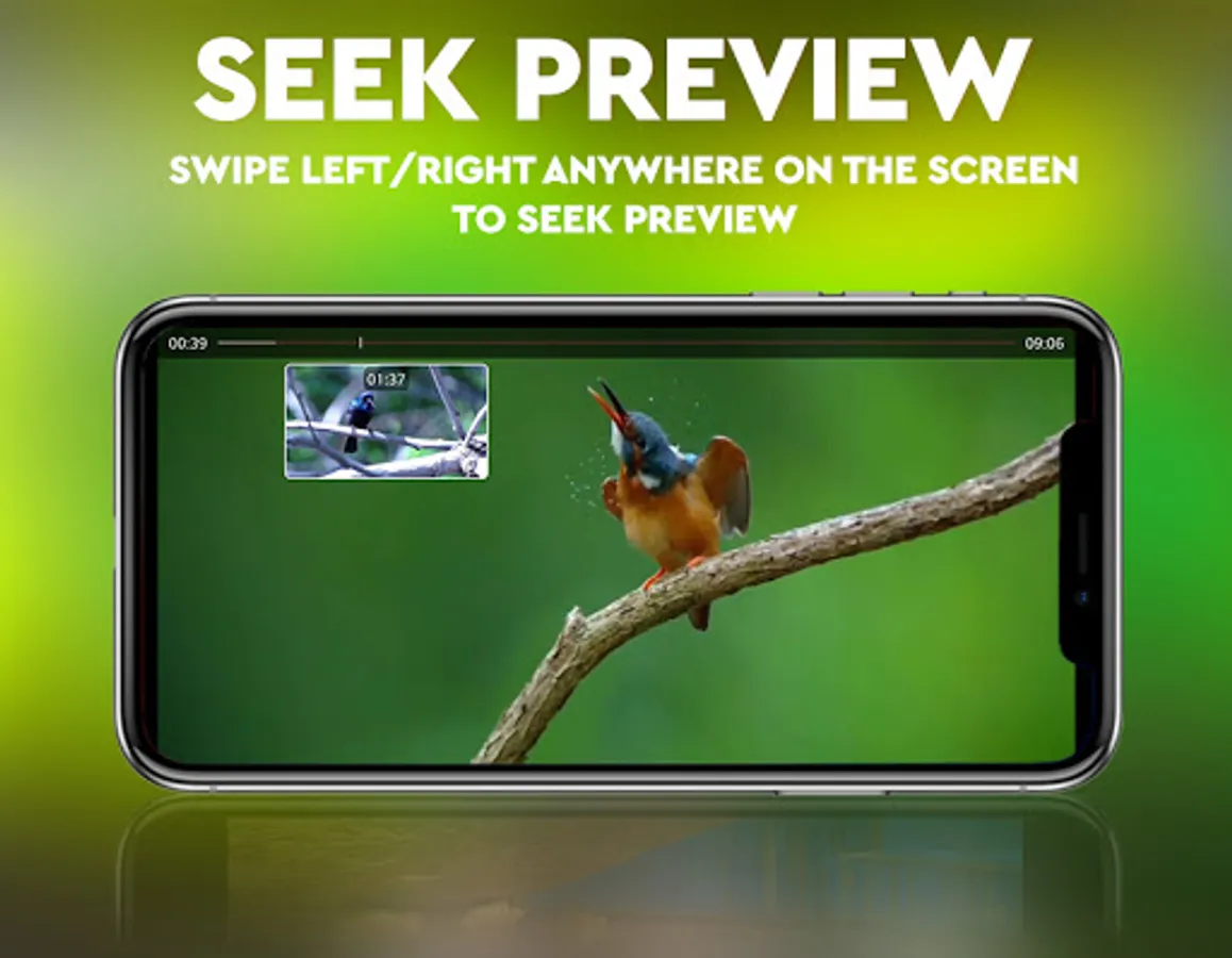 - Seek preview, that is, ability to preview the video frame before actually seeking to it without interrupting your video viewing experience as you swipe left/right on any area of the screen or drag the seek handle.