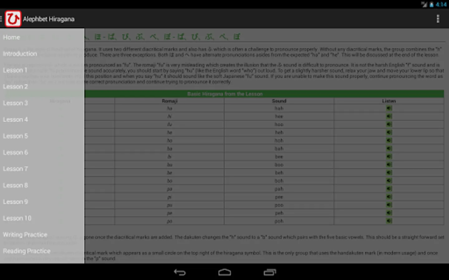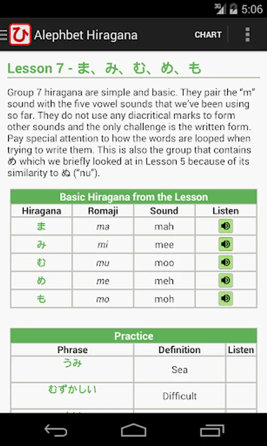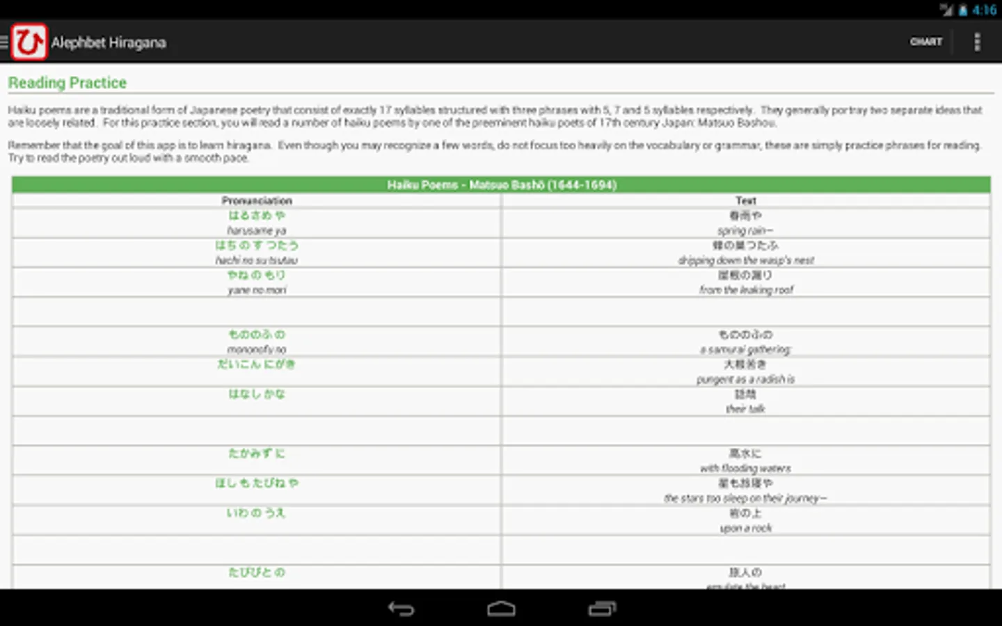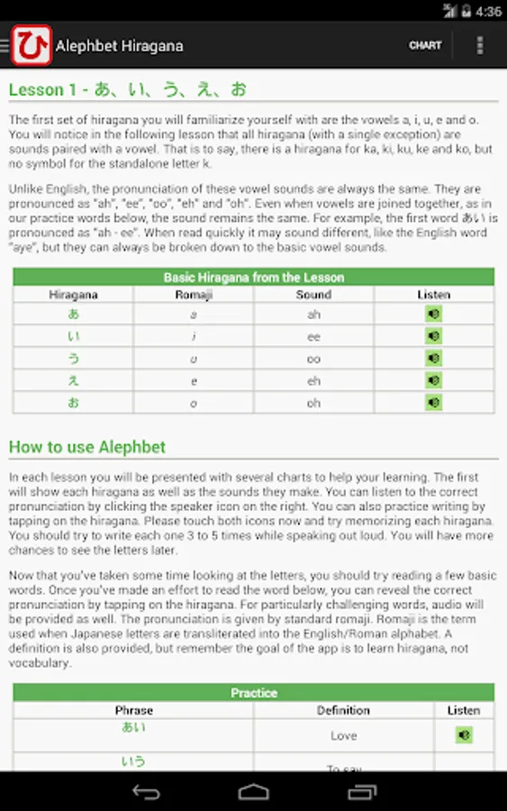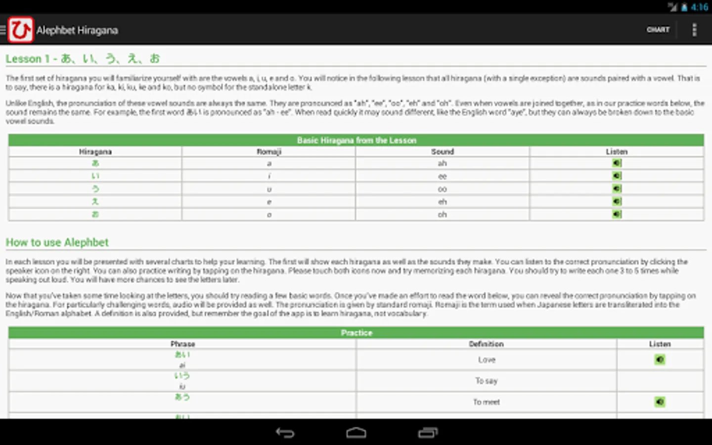 Learning Hiragana is not as difficult if you learn it incrementally. Too many people try to cram everything overnight; they get frustrated or they forget in a week. Alephbet Hiragana contains organized lessons designed to let you read complete words and phrases as you go that will give you the practice you need to make it stick. As you enter the practice session after each lesson, you can comfortably and confidently read words that contain only the Hiragana you have learned so far.