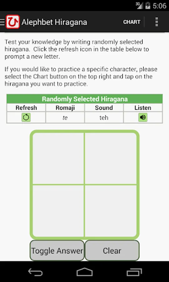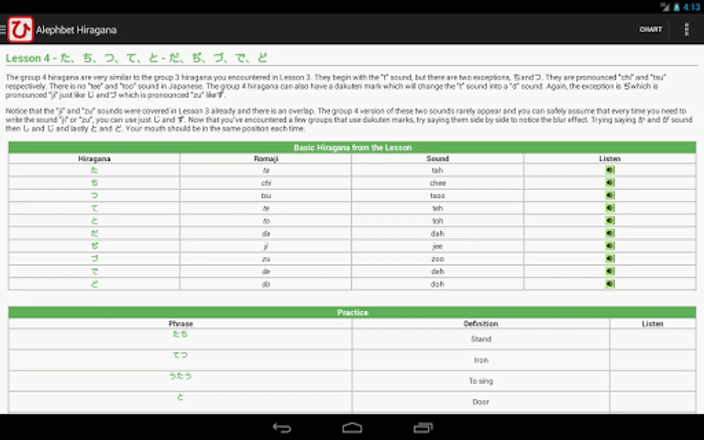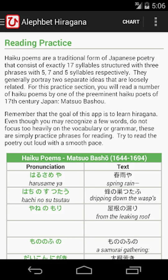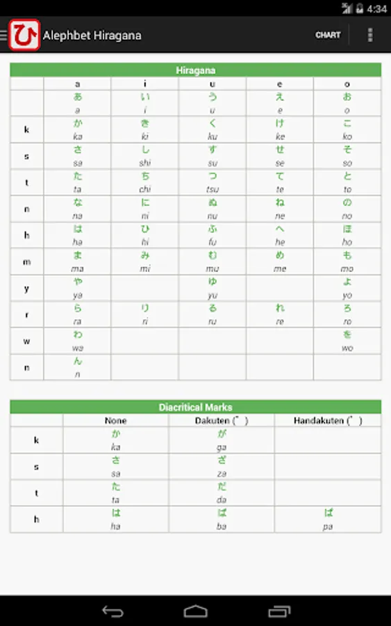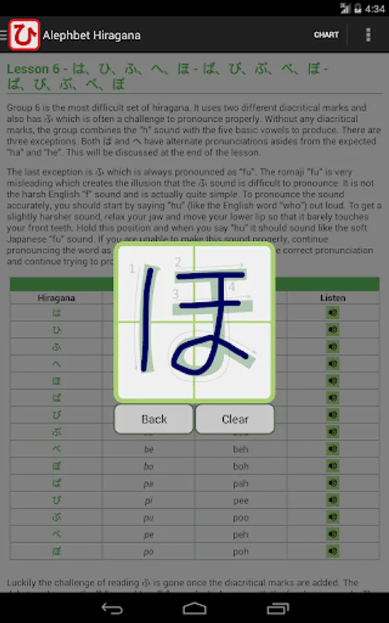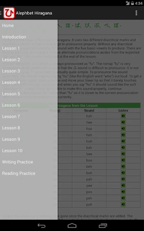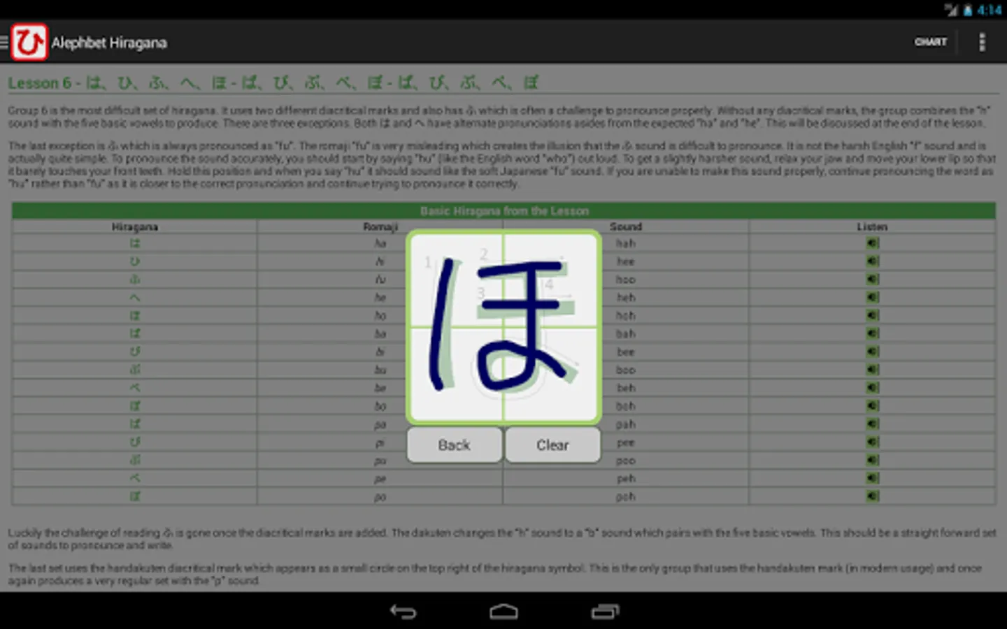 Learning Hiragana is not as difficult if you learn it incrementally. Too many people try to cram everything overnight; they get frustrated or they forget in a week. Alephbet Hiragana contains organized lessons designed to let you read complete words and phrases as you go that will give you the practice you need to make it stick. As you enter the practice session after each lesson, you can comfortably and confidently read words that contain only the Hiragana you have learned so far.