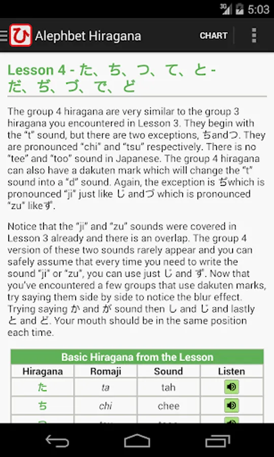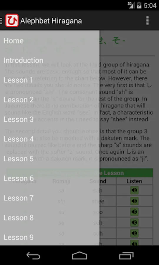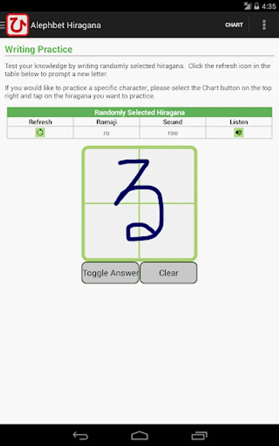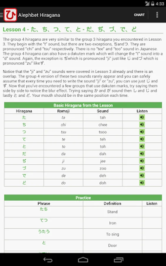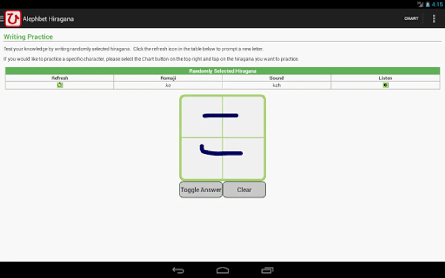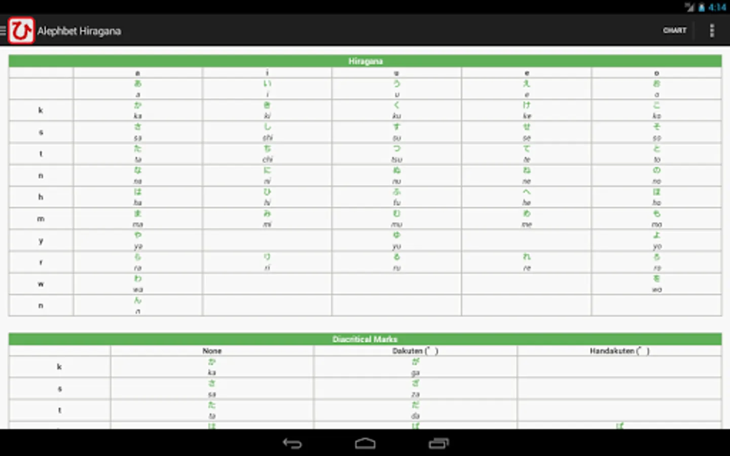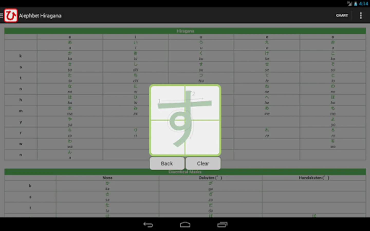 Learning Hiragana is not as difficult if you learn it incrementally. Too many people try to cram everything overnight; they get frustrated or they forget in a week. Alephbet Hiragana contains organized lessons designed to let you read complete words and phrases as you go that will give you the practice you need to make it stick. As you enter the practice session after each lesson, you can comfortably and confidently read words that contain only the Hiragana you have learned so far.