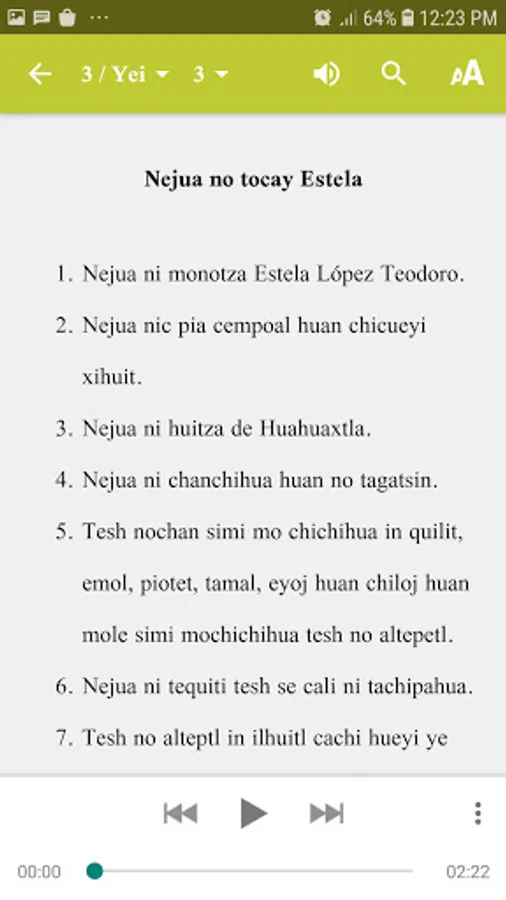 The Nahuablante project consists of the development of an app for the Android operating system, which summarizes a series of dialogues, one for each participating Nahuablante, where their thinking and feelings are briefly documented, based on 20 basic questions.
