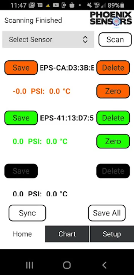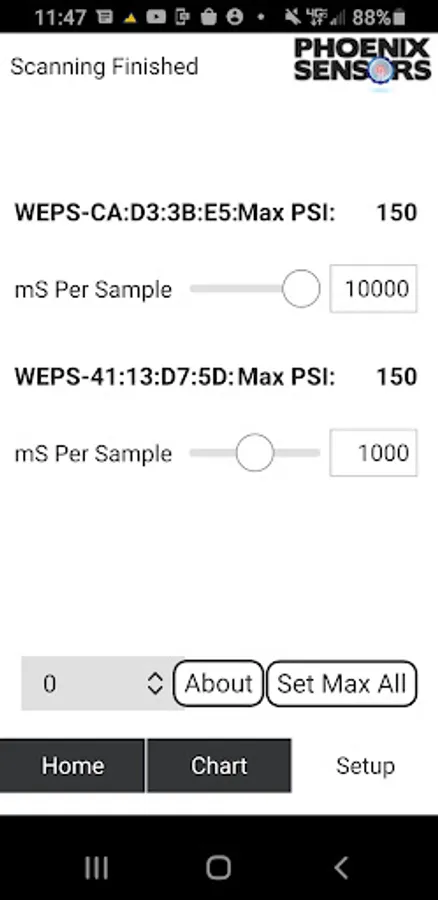 This Android software is used with the Phoenix Sensors WEPS04 Pressure and Temperature transducer. It allows users to monitor up to 4 sensors at one time, with update rates as fast as 5 milliseconds (200hz). It displays both pressure and temperature information for observation. The software also allows the user to synchronize all four sensors to within 25 milliseconds of one another. The user may also save data to the Android device as a .CSV (comma delimited) file where one can analyze the data in an excel spreadsheet (or similar).
