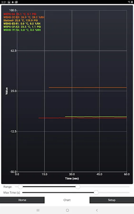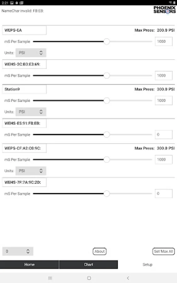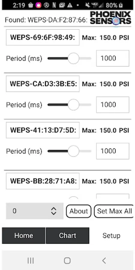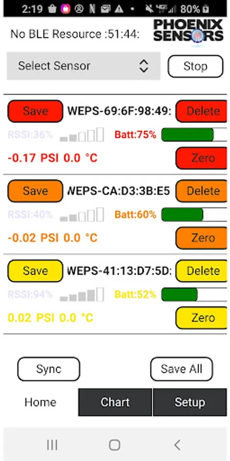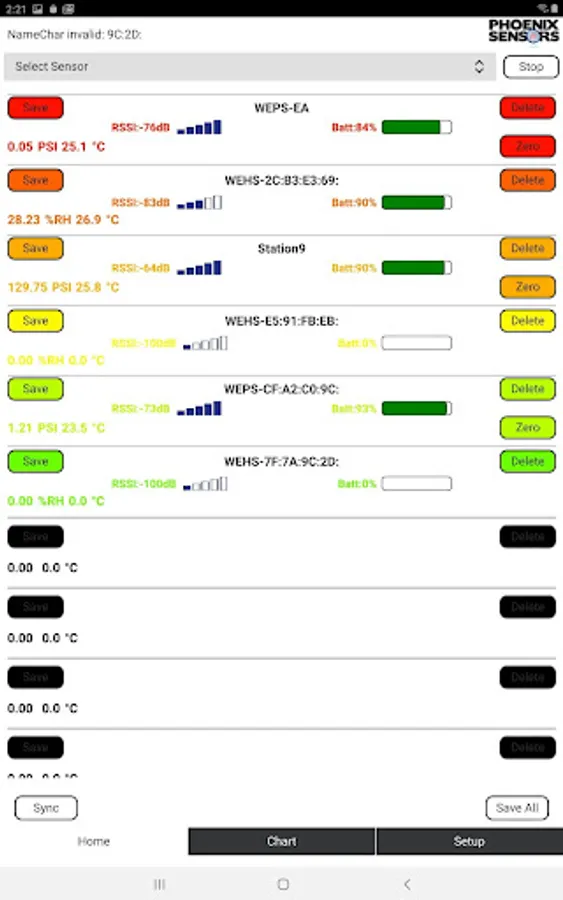 Setup, view and save data, from Phoenix Sensors BLE sensors. Can monitor up to 10 sensors!