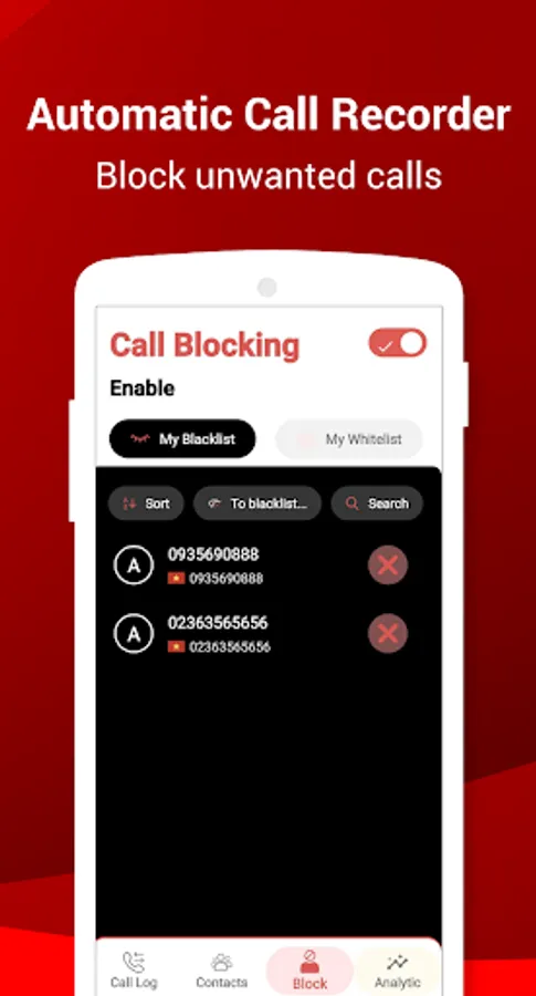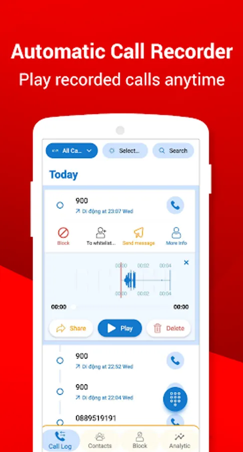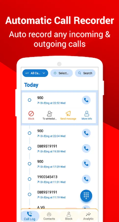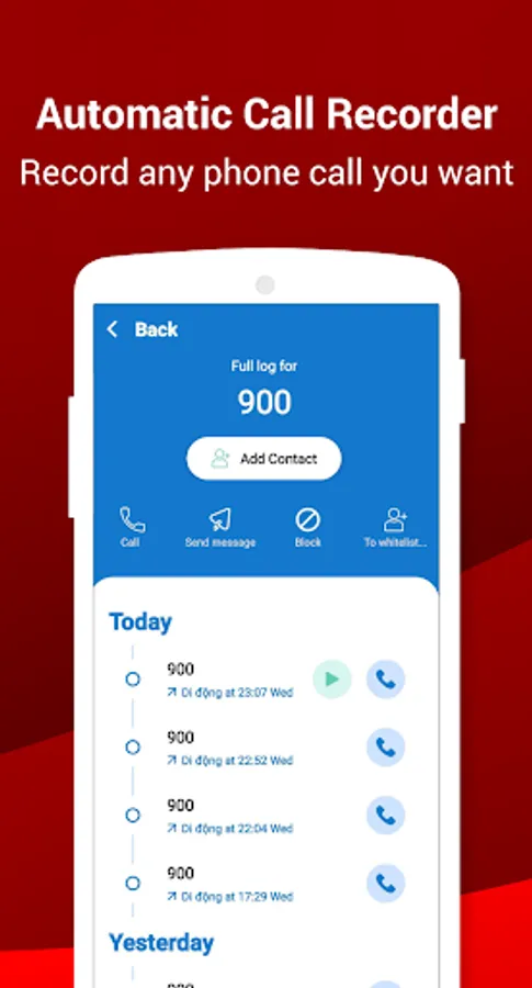 Call Recorder is very easy to use. You can white list which calls to record and which calls to ignore. You can enable or disable Call Recorder to automatically record all calls, outgoing calls, or incoming calls.